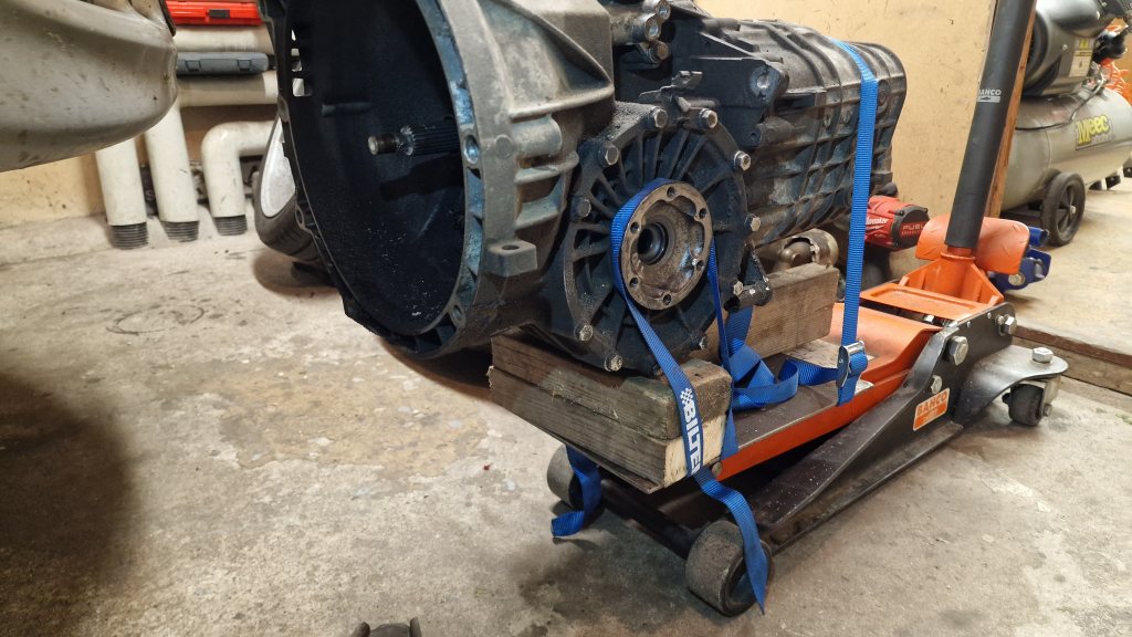 Bilen fick komma till mig för div. Felsökning då den lät illa från koppling eller växellådan. Beslutades om att plocka ner lådan. Fick först tillverka en platta åt domkraften vilken fungerade helt ok. När jag särade på motor och lådan så trillade det ner illavarslande aluminium spån. Den kom ner och det visade sig snart vad som orsakade det. En bit hade gått ur tryckplattan som sen åkt runt och orsakat oljud samt skavt bort aluminium. Det blev en rejäl beställning från 911design med alla oljor och kopplingsats.