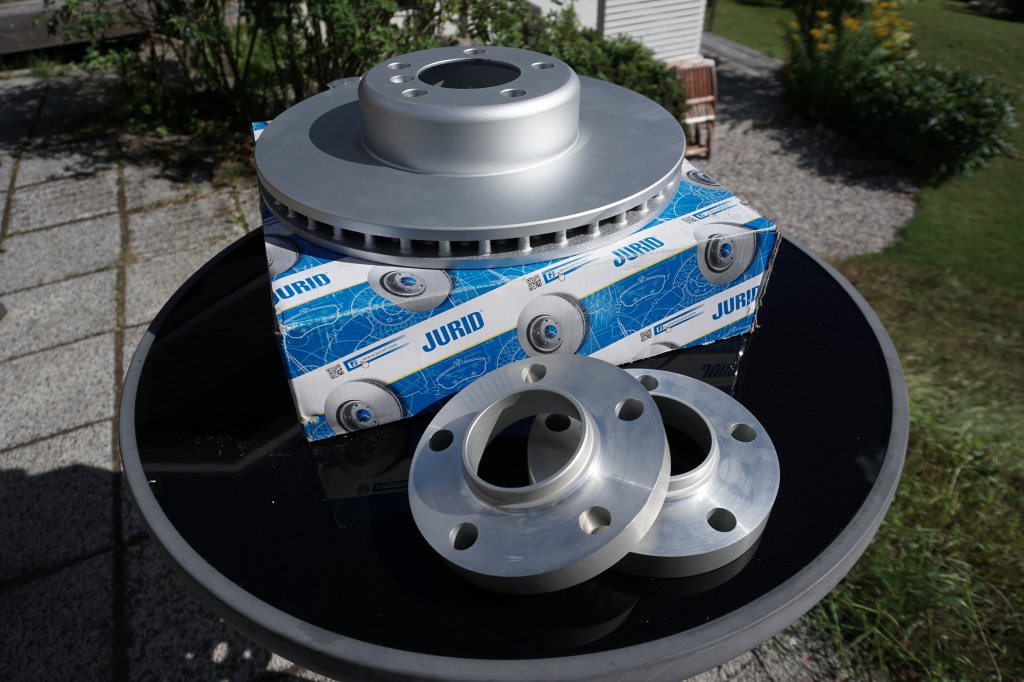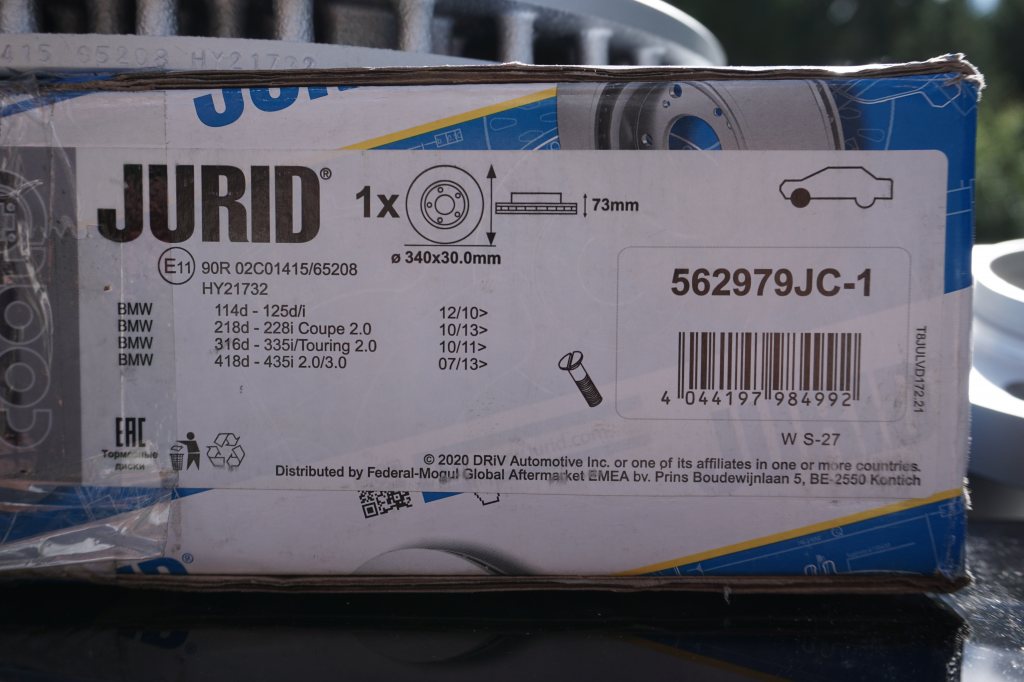 F3X 340i främre bromsskivor (340mm), OEM tillverkare av märket JURID. Köpte de tillsammans med spacers som jag svarvat för att köra tillhörande bromsok fram på e46. Men jag har ändrat mig och ska köra en annan setup. Säljer därför dessa, helt nya. Spacers är nog inte helt perfekt svarvade. De centrerar inte bromsskivan helt. Skulle behöva svarvas ned ca 2-3mm till för att bli exakta.