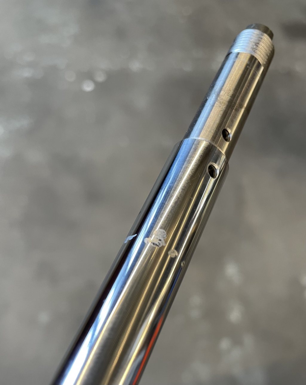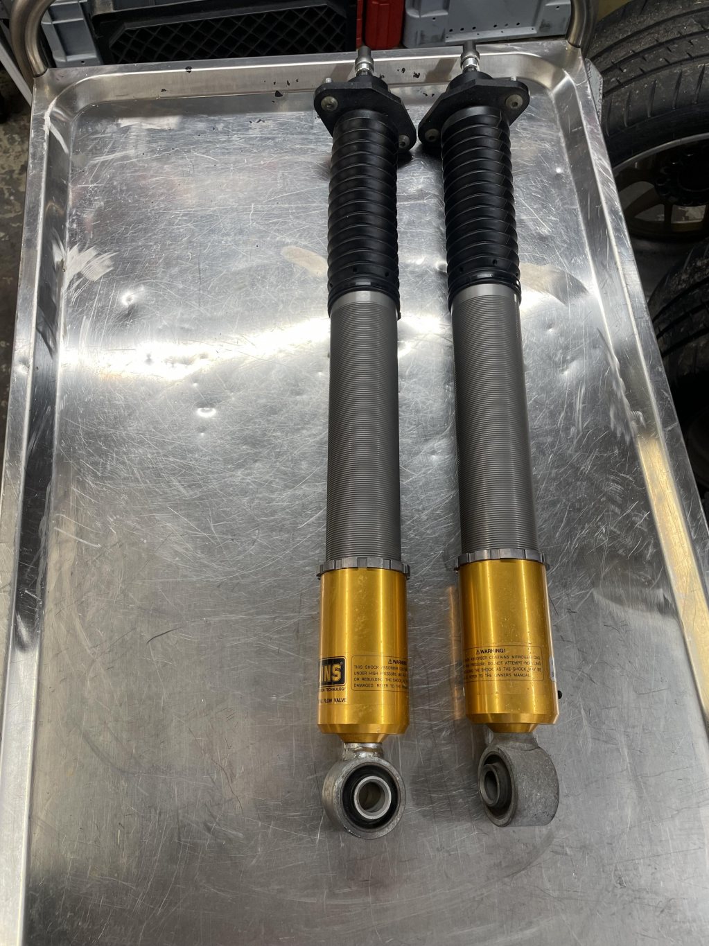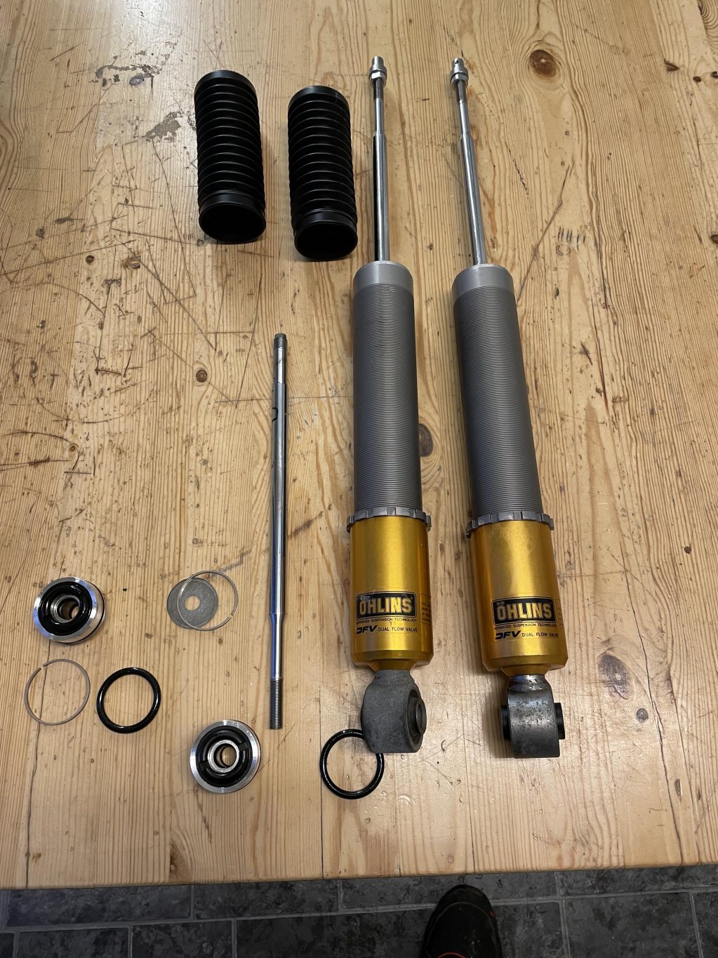 Typ "crome släpp" på en dämpare. De är 9år gamla, men att de började läcka beror nog på att jag missade att montera damaskerna bak. Det blev en ny kolvstång och nya tätningar/olja. Bra med en översyn. Numera så sitter det damasker på. Crome släpp: