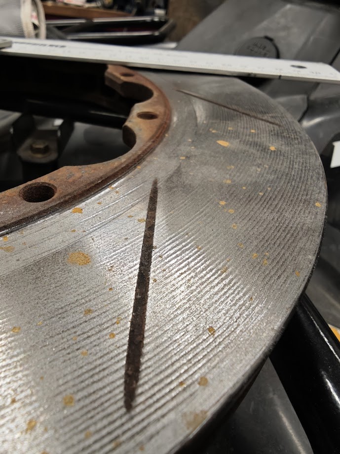 Cementit. Järnet omvandlas och får annan hårdhet och friktionskoeficient. Det skulle teoretiskt gå att svarva (eller helst slipa medelst slipskiva) ett tunnt lager med friskt material men frågan är hur mkt du kan ta bort innan skivan blir för tunn?