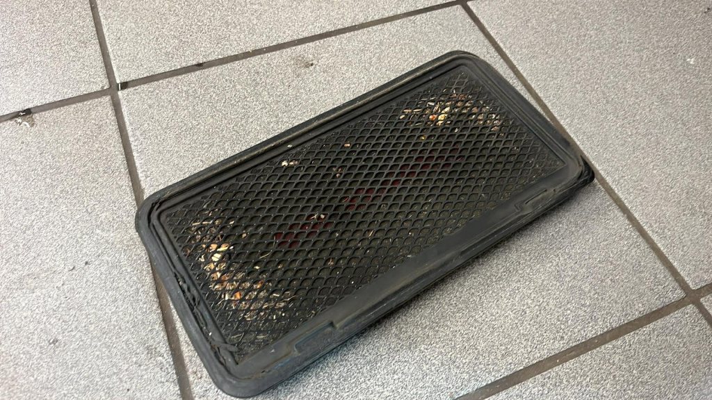 Intressant nog och konstigt var att när jag tog ur de gamla stiften så var det 3st av en modell och 1st av en annan, alla dock Bosch. För en bil som bara är servad på "fina firmor" och inte hemmamekad så blev jag förvånad. Men vi amatörer kanske är bättre än proffsen ibland ändå eftersom vi kan ta överdrivet lång tid på oss... Nu sitter det iaf 4st nya och likadana stift i! Sen luftfilter! När hjulen ändå är av går det snabbt att byta luftfilter då man gör det genom innerskärmen vänster bak, loss med den och ut kom detta: