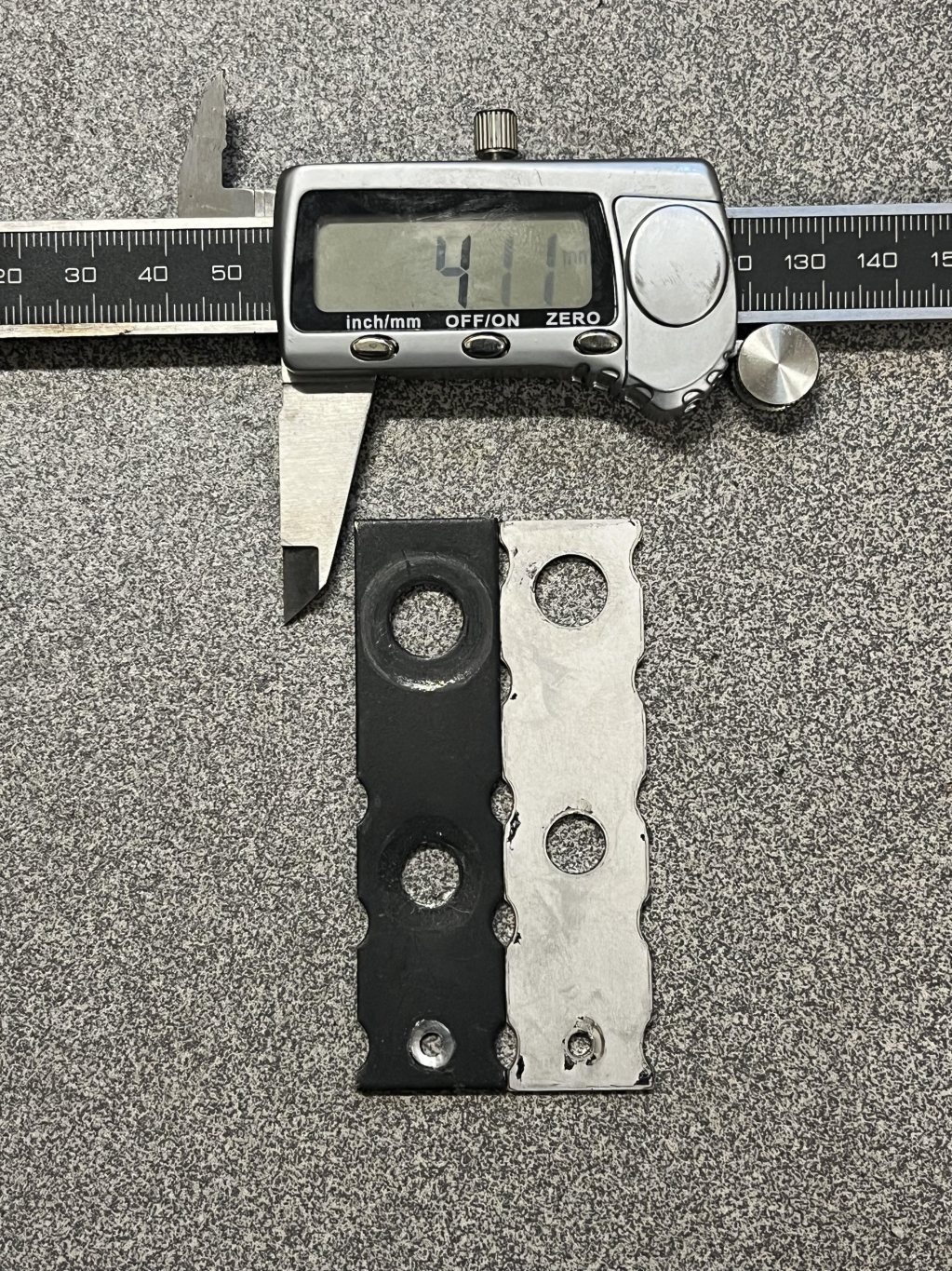 Och på insidan sitter det motsvarande bussningar för styrning men även en rostfritt förstärkningsplåt. Lyckligtvis så är denna modell lite kraftigare än de enklaste som bara sitter med popnit, denna använder utöver ledens M10 skruv även både 2xM8 och 1xM6 för att styva upp. Ännu bättre är att 2 av 3 fästen återanvänds från original så endast ett hål och tillhörande mutternit behöver monteras Jag är inte sugen på att ha genomgående skruv och mutter på en skruv och insatsgängor på originalfästena, då får det bli att montera en M8 mutternit på nya hålet med