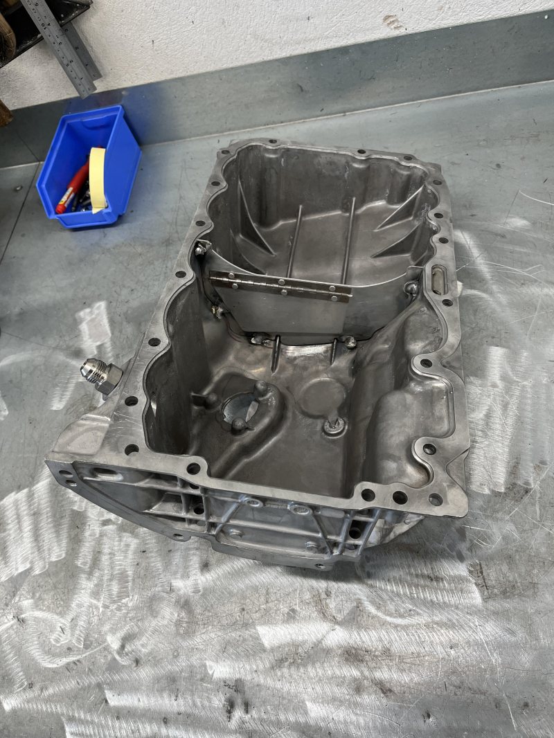 Har även svetsat i baffel i tråget. När väl denna maskin kommer i blir det slicks. Lika bra att vara på den säkra sidan. Borrade upp hål i sumpen, gängade och monterade adapter till riktig oljesticka.