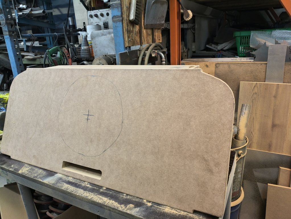 Och med nya monteringsplattan på plats i sidofacket, första prov så jag får ner allting då luckan är mindre... Det var den produktiva biten, sedan lite förberedande. Pappa fick hjälpa mig tillverka ett kompletterande verktyg, så nu har jag en passare så jag kan skära runda fina hål.