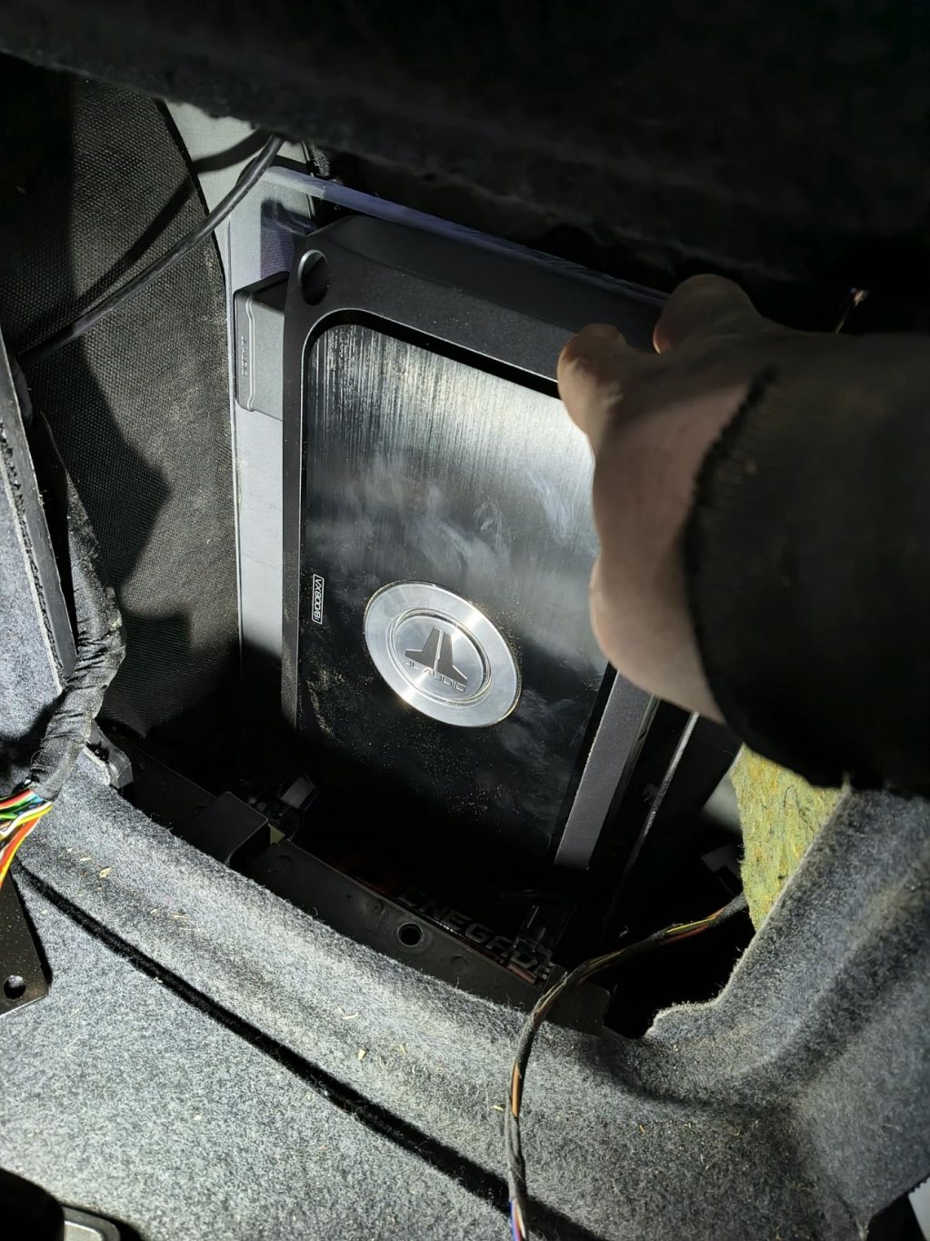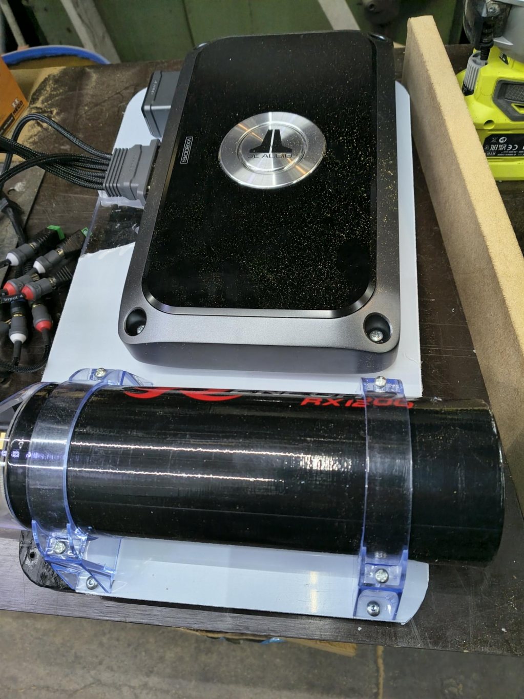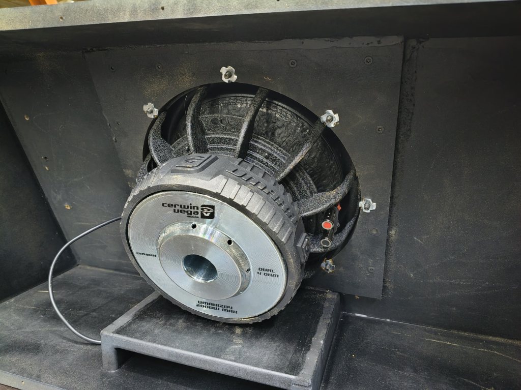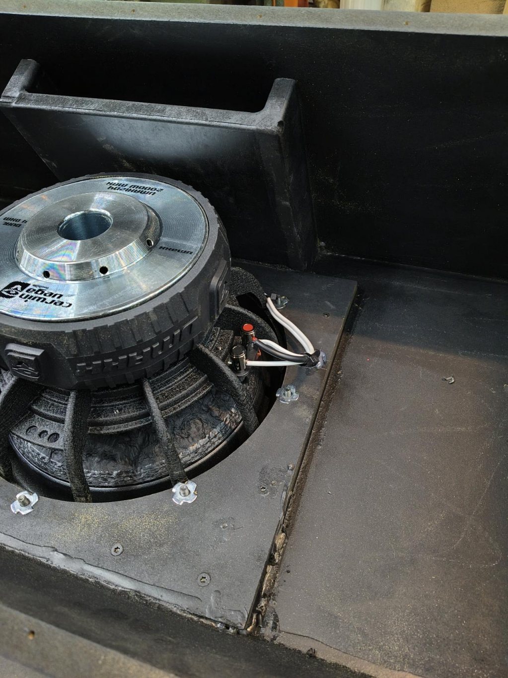Nu har basen skruvats fast. Och lite skumplast för att täta basporten och hindra täckplattan från att vibrera. Påbörjat kabeltattning i lådan.