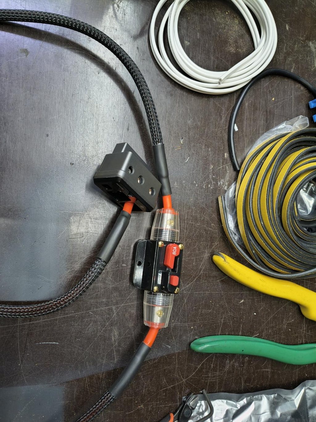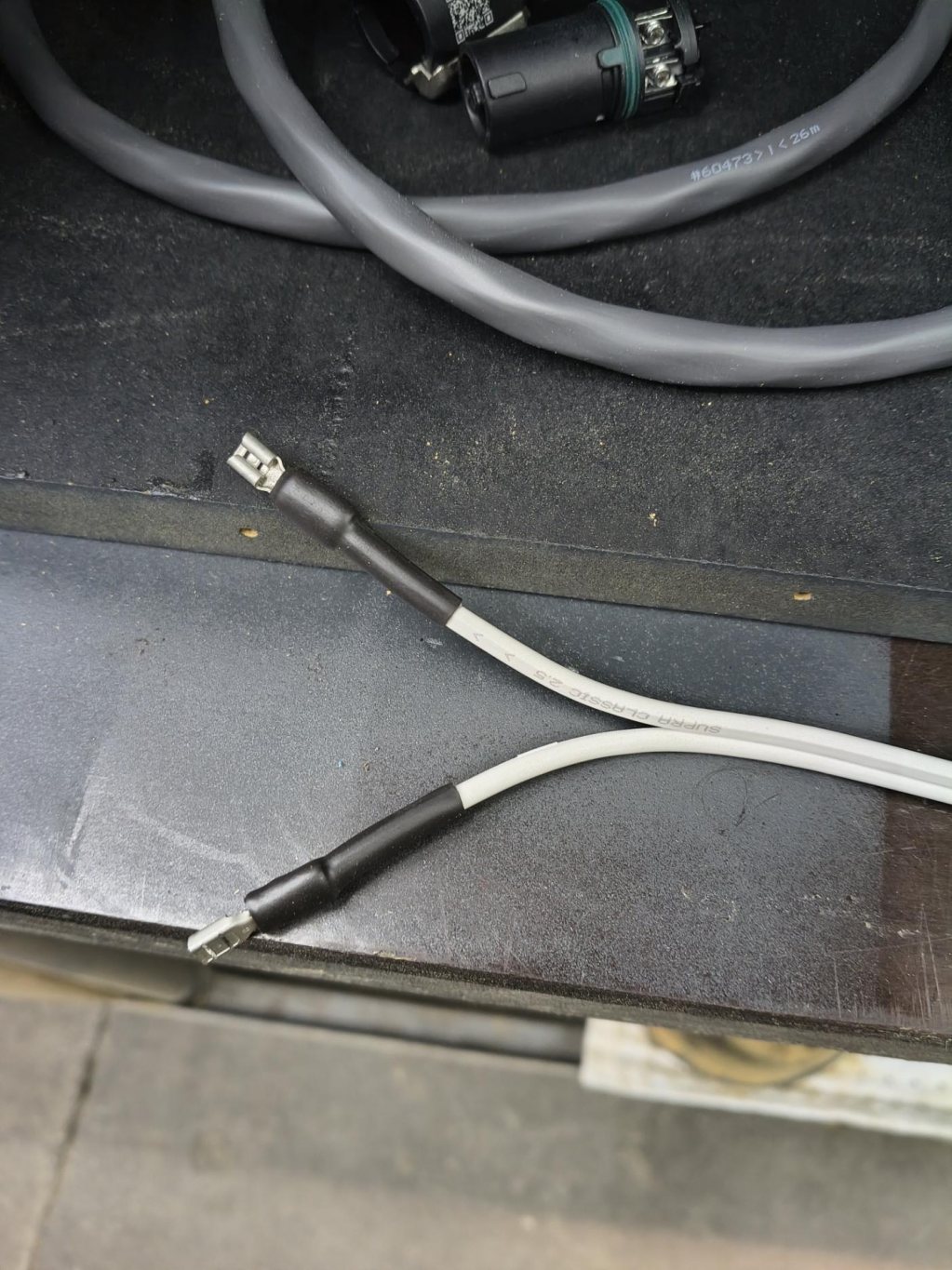 Hade kanske inte behövt köpa röd (orange) kabel för plus och svart för minus, med tanke på hur mycket av kabeln som syns. Lite kul att audi använt likadan strumpa på pluskabeln till batteriet
