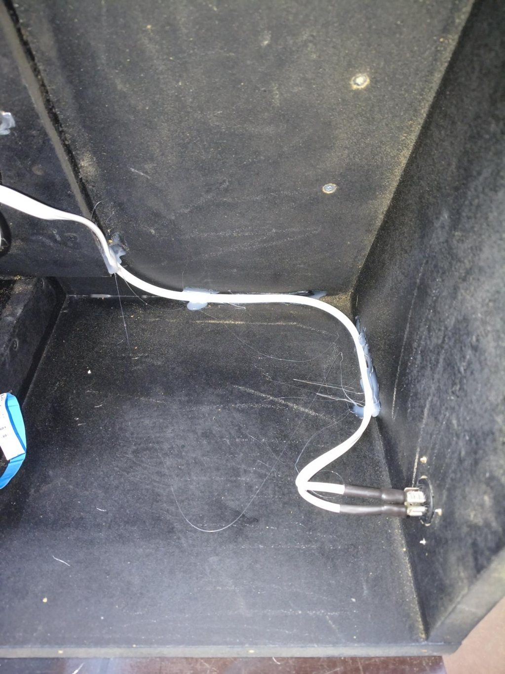 Säkrat kabeln med lite smältlim. Som avslutning lyckades jag ha sönder en skiva på lådan, ibland är man dum i huvudet. Så det är bara bryta ihop och demontera och såga till en ny skiva. Tur att jag köpte två stora skivor så det finns material kvar... Orkade inte ta någon bild på eländet.