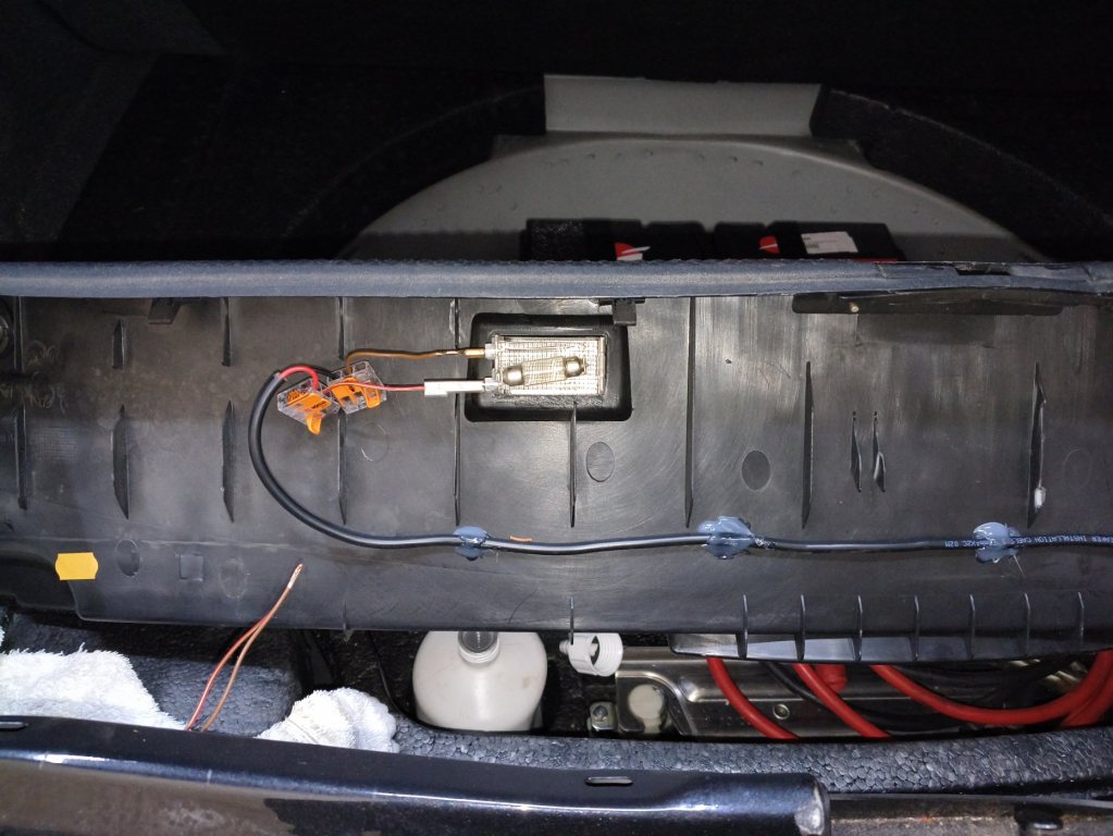 Tack för tipset. Både batterier och kondingar tappar ju, så väl värt att kolla så man inte fått ett ruttet exemplar. Skarvat in mig på sladdarna till original belysning i bagage, dragit kabel vidare och sedan börjat återmontera inredning.