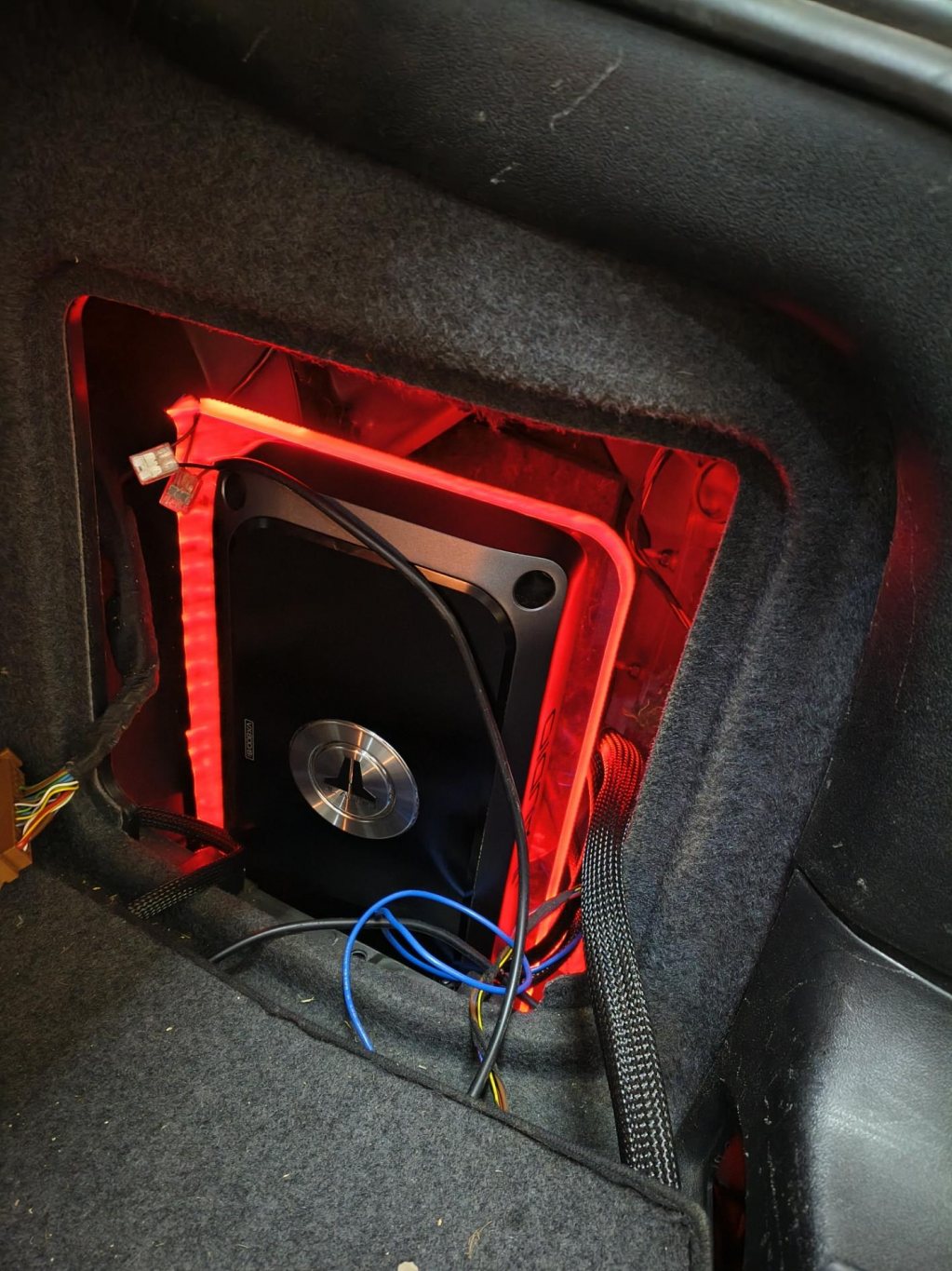 Och som det kommer se ut bakom ryggstöden. I alla fall till en början. Tror jag har för lite mellanrum mellan högtalarens yttre upphängning och min täckskiva för att det ska lysa ut lite svagt rött ljus, får fasa baksidan på täckskivan mer i så fall. _________________ Roland Johansson |