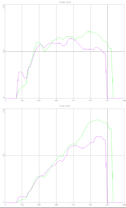 Det här med effekt i en rejält trimmad sug motor är att det skall vara avstämt rätt minsta lilla fel nånstans gör av sig mer än man tror... det visar denna bild från en logg från en Golf Kit car rallybil, effekten och vridet skall man ta med en nypa salt då det är en massa inställningar som inte är rätt det intressant är ju skillnaden