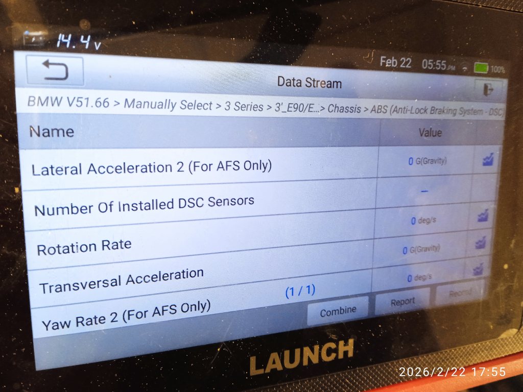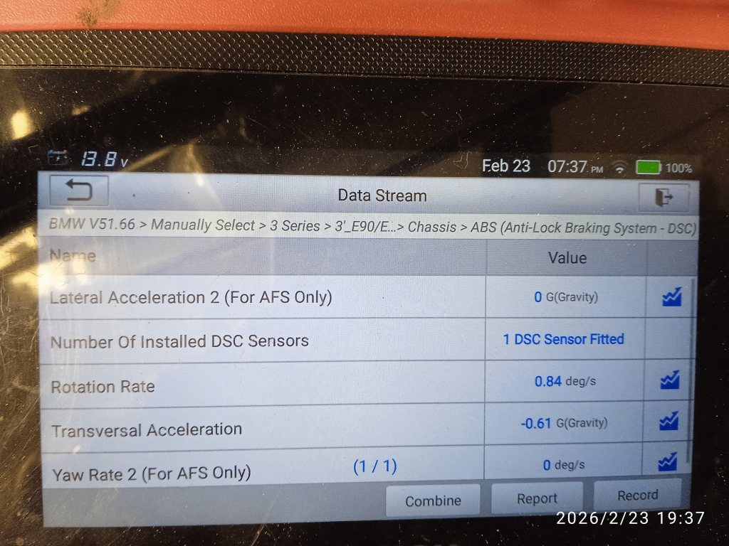 Nu fick jag in fina värden från DSC sensorn. 2 av värdern (AFS only) är för aktiv styrning. Det används bara på vissa BWM modeller. Min mk60e1 ABS verkar stöder dubbla SDC sensorer. Gissar det ökar noggrannheten. Så jag köper väl en till och kopplar in. Dom har unika ID så det är bara koppla parallellt.