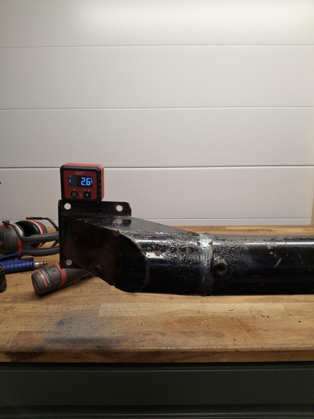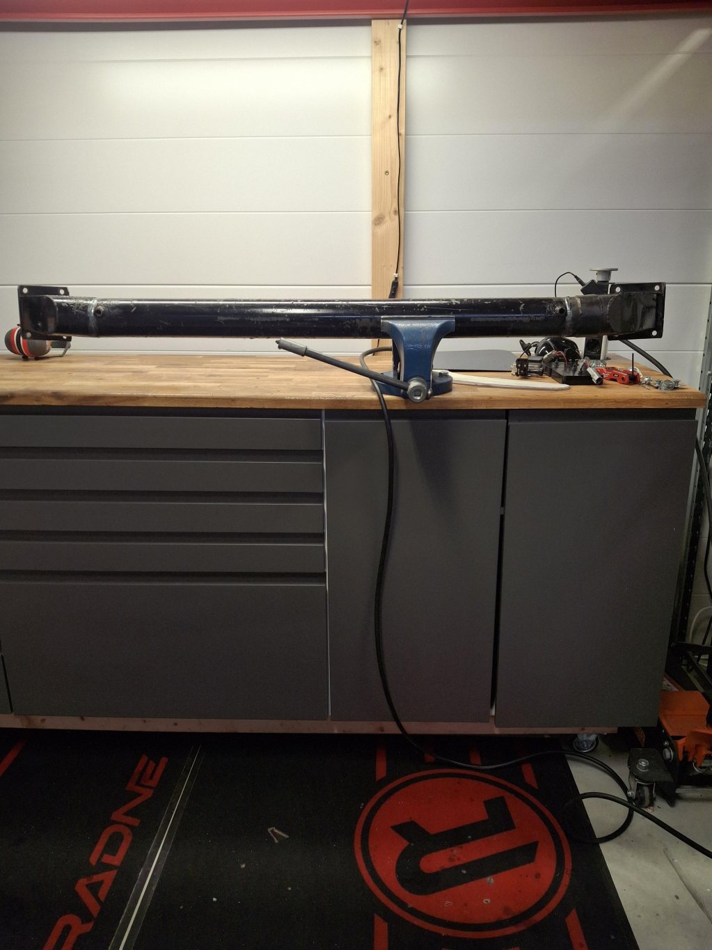 Så jag fick lite extratid över så passade på med lite experiment.. Hade ett extra gammalt (lagat) dedion rör som jag sparat på. Snittade upp denna och "skränkte" den till ca 2.5 grader camber, och mycket mindre toe in än vad den hade innan. Tanken är att försöka få hjälp under säsongen att mäta däcktemp bak, byta rör samma dag/helg/tävling och utvärdera. Troligtvis är 2.5 grader för mycket bak, men tänker med datan från bägge rören kan jag killgissa mig fram till en bra kompromiss, och framförallt känna hur den beter sig. Sedan bygger jag ett helt nytt rör i lugn och ro