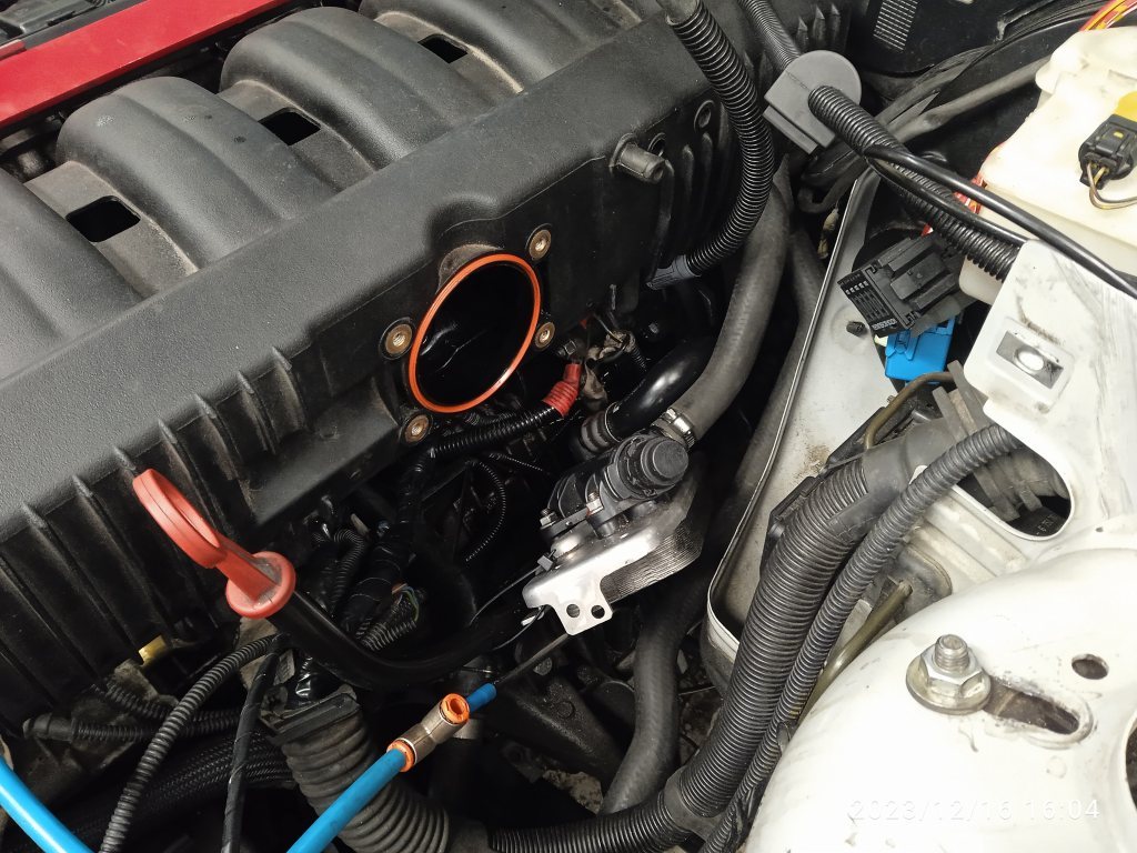 Turbo med olje och vattenrör på plats. Downpipe lindad och anpassad med V-band och avgassystem klart!