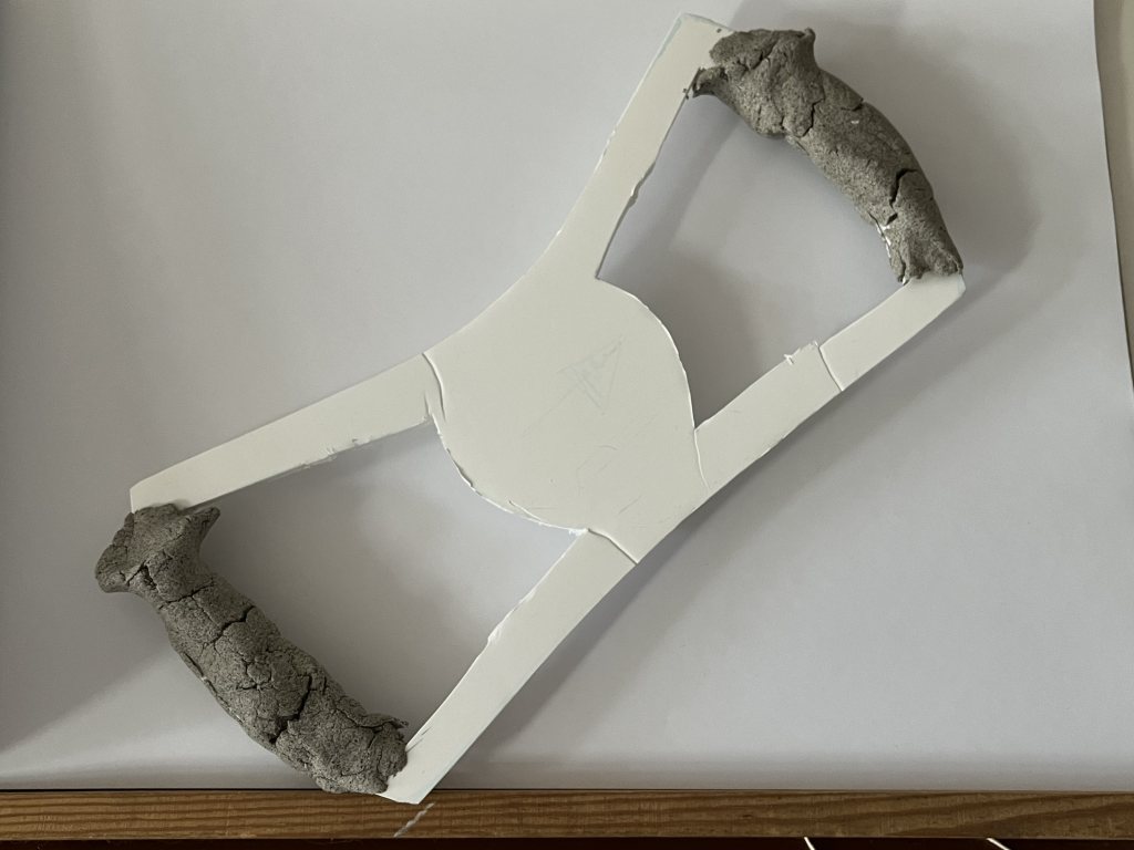 Med det "avklarat" var det dags att gå tillbaka och titta på ratten. Luisiratten som Mats körde med är väldigt trevlig, men tar också mycket plats där mina lår vill vara. Jag funderade fram och tillbaka, och testade till slut att göra den mycket enkel egen ratt. Först tog jag foamboard/kapaboard och skar ut en version av ratten. Med den i rimligt format, tog jag lufttorkande lera och testade snabbt att göra några grepp: