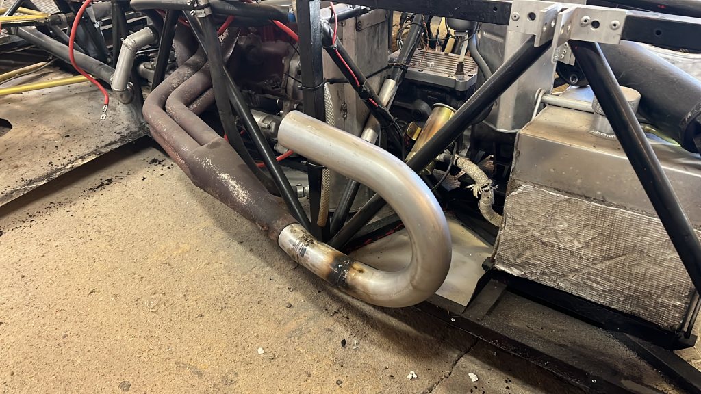En hel bunt bockad aluminiumplåt. Jag måste nog lära mig att älska/hata popnittången igen ... Jag har också jobbat på avgassystemet. För att förenkla systemet lite, och förbereda för framtida cool aerodynamik, så har jag dragit om systemet från att snirkla sig in och ut ur bilen ända till aktern, till att istället göra en 180-gradersböj och gå ut bakom framhjulet. Men för att tillåta en 180-gradersböj fick jag så klart skapa en massa andra vinklar. Det här är också första svetsandet jag håller på med, nästan någonsin, och det är pinnsvetsning. Nej, jag helsvetsar inte utan försöker bara få sakerna att hålla ihop.