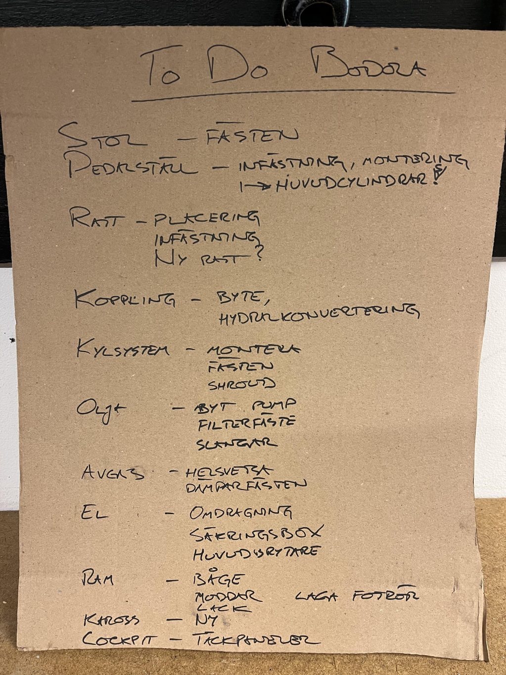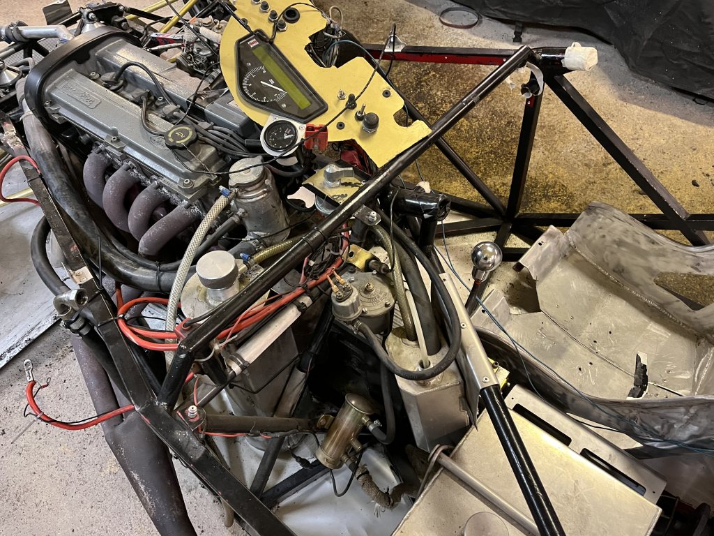 Det lär tillkomma många olika små projekt för att få ut bilen på bana, och saker jag själv vill förändra, men nu är nog tråden hyfsat i takt med tiden: det är cirka 26 timmar sedan sticksågen stannade och jag har inte provsuttit allting med mina prototypändringar av buren ännu. I övrigt finns väl flytt av ljuddämpare, ny dragning av bromsrör, och konvertering till hydraulkoppling (stort tack till Gustav U för hjälp med identifiering av delar och tips på länkar där!) på agendan, men det är mer av kategorin "mysmekande" än riktiga problem att lösa.