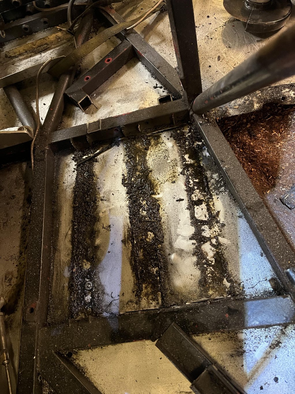 Det här gav två följdmodifieringar. Jag fick kapa bort rännorna för det gamla pedalstället, för att få ned detta så lågt som går.