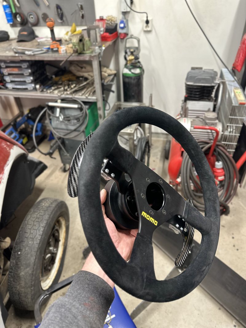 Nu har även en riktig ratt med magnetiska paddlar fixats. Detta längtade jag mest efter på grund av att jag har så långa ben och länge velat komma bak med stolen mer. Rattnav plus spacer löste detta.