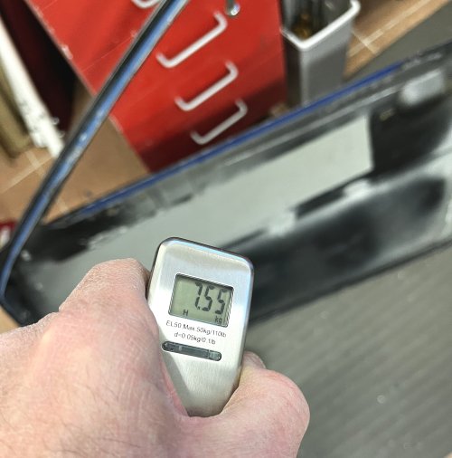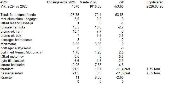 den lilla gummivingen väger 2,35kg 2024-års baklucka vägde 12,05kg 2026-års baklucka väger 7,55kg som är 4,5kg lättare. Om jag väljer att köra med en större 944-gummivinge eller 968-vinge blir det bara 3kg lättare. Det blev riktigt bra tycker jag så det var värt allt jobb för att få bort 4,5kg långt bak och högt upp