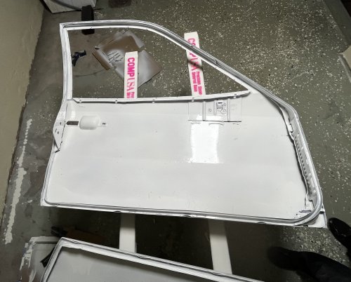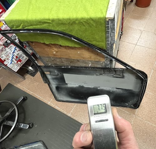 tom förardörr 7,75kg och tom passagerardörr 7,55kg på förra dörrarn vägde dörrhandtag + lås + makrolonruta 2,3kg det blir preliminärt 10kg insparat/dörr, och det är bara 3,2kg/dörr mer än för de tidigare så flimsiga plastdörrarna
