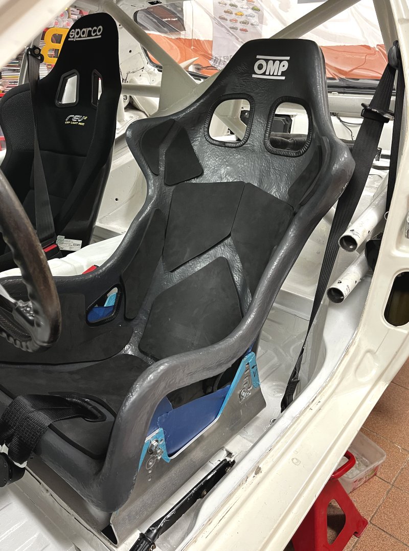 Det börjar bli ont om Fia-godkända stolar utan öronlappar om man är över 1,80 i längd. Trendab hade kvar några OMP Off Road som även den är på utgående, lite tung/grov med sina 8,35kg. Den är ändå 2,65kg lättare än den tidigare.
