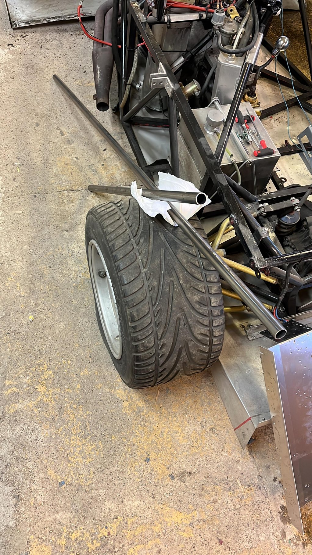 Redan ifjol insåg jag ju att jag skulle behöva en ny huvudbåge för att få köra bilen. Jag behövde alltså beställa rör, och en lite väl hård läsning av SBFs tekniska reglemente gjorde att jag hamnade på Docol R8 i 50*2,5 mm. Så beställning av ett antal kapade (och vissa bockade) rör, plus tillsatsmaterial för TIG-svetsning, gjordes från ME Racing.