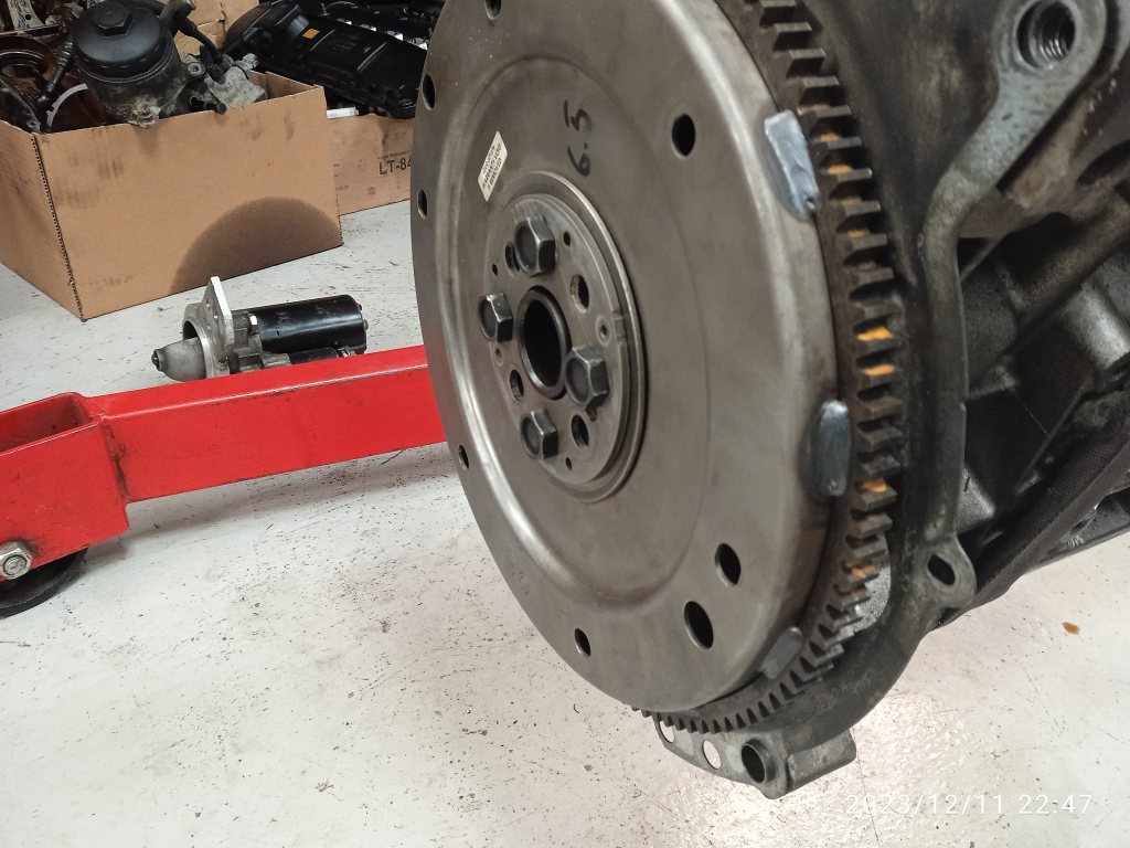 På bilden (som är gammal) ser man att den bör gå flytta själva startkransen en bit bakåt på flexplattan. Beställer väl en extra flexplatta/startkrans och kan börja med jobba med utan behöva plocka ner lådan.