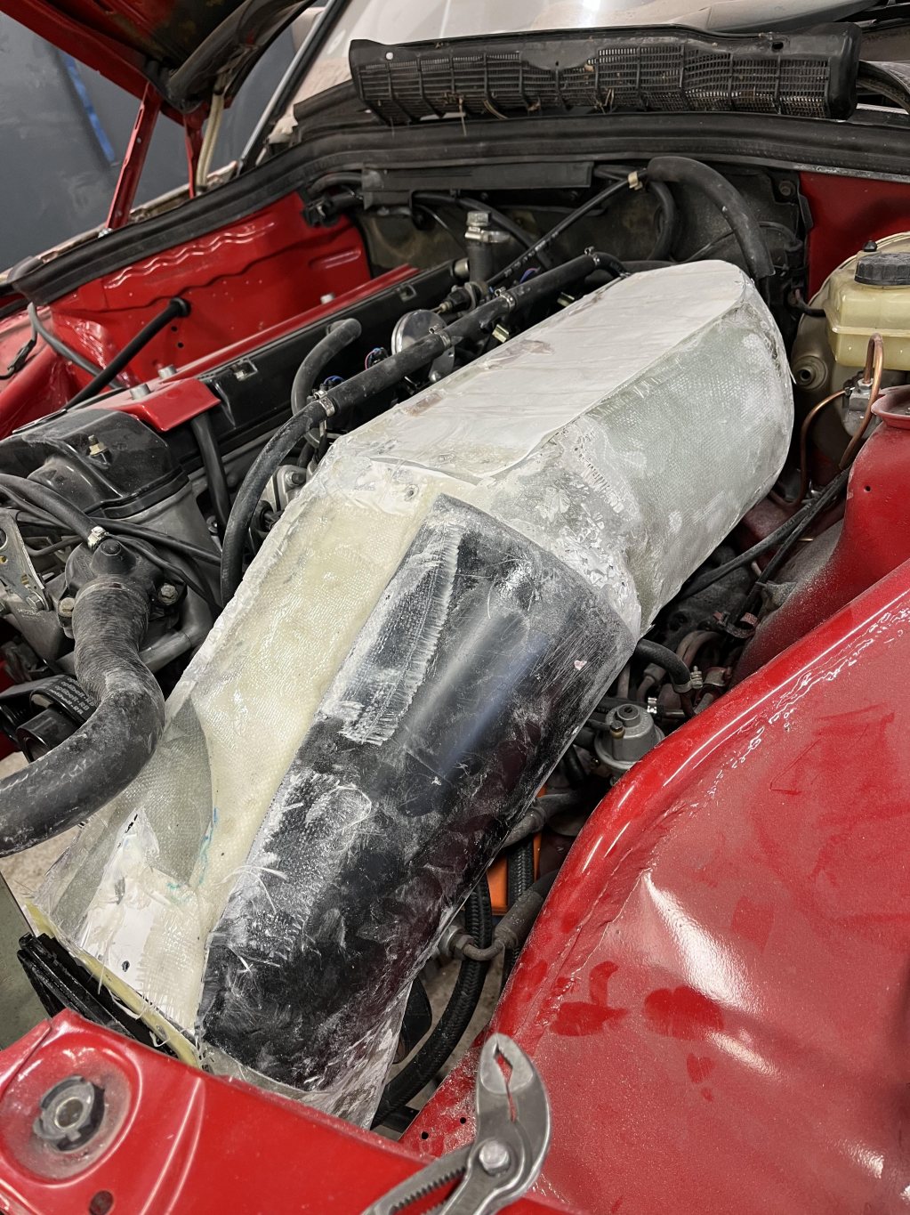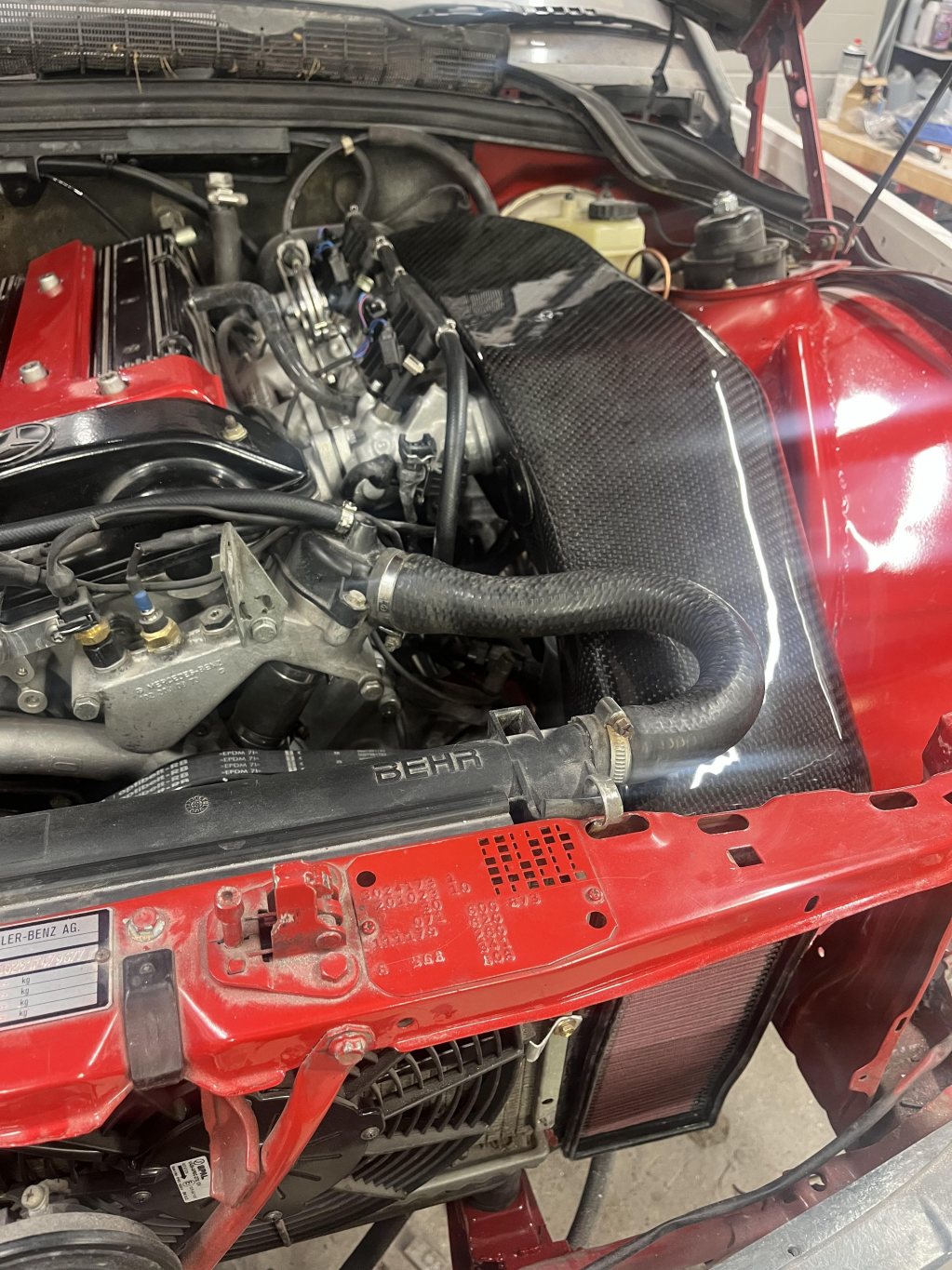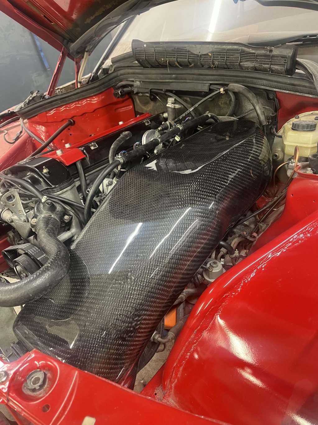 Fick hjälp med ett avslutande lager kolfiber så såg det lite trevligare ut! Nu får den kall luft och förhoppningsvis låter insugsljudet som det ska🙏
