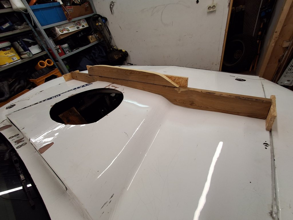 Har lyft upp bilen inne igaraget iaf. Tänkte försöka se över mekanik och kaross medas farsan mekar motor hemma hos sig. Tänkte försöka fixa till min motorhuv, den blåste ju av på mantorpsrakan 2025 ( och dessutom överkörd!) Vi lagade den ju hjälpligt med lite aluplåt och popnit i depån på mantorp, men sedan har jag inte gjort något. Hur gör jag här? Känner inte jag hinner ställa mig att laga upp den för att gjuta en form och sedan gjuta ny huv. Den var ju inte så snygg innan heller ifs men nu ser det väldigt tråkigt ut... Glasfibern är intert sprucken lite här och var, huven är liksom mjuk överallt. Lacken är sprucken typ överallt, fläker upp sig när man böjer huven, men bitarna sitter kvar om man låter de vara. Huven har ändrat form så höger/vänster ser olika ut... Glasfiber synlig i hörnorna. Dessuton är det svårjobbat då huven inte alls passar på bilen längre utan man får liksom spänna ned den på huvpinnarna, man man måste liksom styva upp den på plats på bilen så den håller formen korrekt.. Var inne på att förstärka undersidan med plywoodribbor/ aluprofiler, så den styvar upp sig,och håller formen, sedan spackla de värsta ställena, slipa ned och sedan dra en garagelack eller möjligen en wrap.. ideer? (Aluplåten mitt på huven håller ihop/döljer en rejäl spricka/hål.)