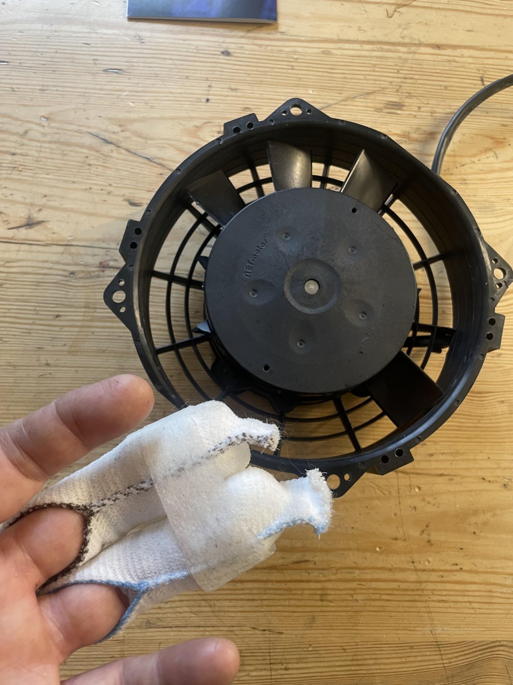 Får gå tillbaka någon vecka i tiden när jag testade med kylaren bakom "CSL" hålet kylaren. Det fungerade ju inte bra, så jag kom på att montera en sugande fläkt bakom kylaren. Beställde en sugande fläkt som var lite större än kylarn var hög. Inga problem tyckte jag eftersom den bara gick ca 20 mm under kylaren. Monterade på Fredag, ut och provkörde på Lördag morgon. Kom tillbaka till garaget o skulle känna på kylaren (motorn var igång så jag hörde inte fläkten) stack in fingrarna för att känna temp på botten av kylaren, det slutade så här: