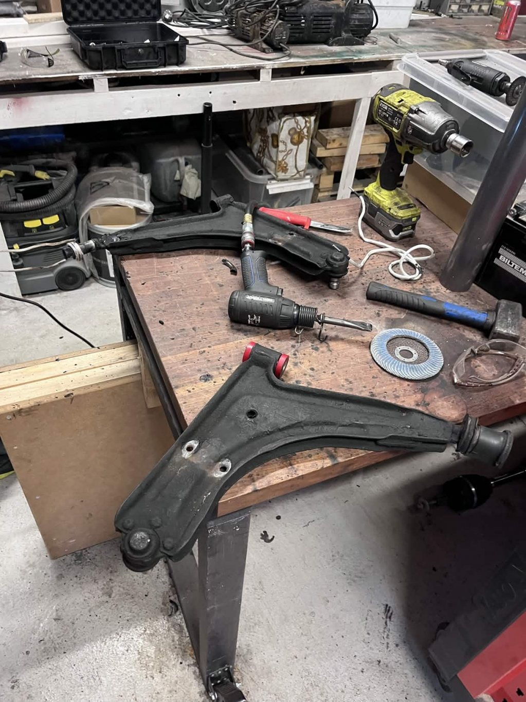 Att få ut bärarmarna var inga problem, men satan vad bussningarna sitter. Med hjälp av en hålsåg, en hammare och gasol fick jag ut en av de främre bussningarna, men den andra ska till en vän med hydraulisk press på söndag.