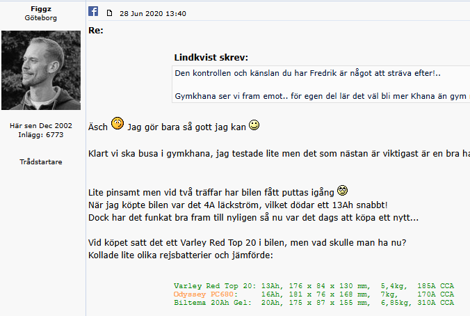 Men denna jävla bil kommer aldrig bli påställd, den kämpar emot med allt i sin makt. Bussningarna fixade, hjulen på, ner på marken, i med nyckeln och ingeeeeeeeeenting händer. Batteriet är så dött att det inte ens orkar dra igång voltmetern, och Dr CTek lyckas efter tappra försök inte återuppliva det heller. När jag bar hem det från garaget insåg jag att detta ju skulle kunna vara en möjlighet att lätta bort lite vikt iom att jag än så länge har kört med ett som väger stabila 20 kg. Vad kör folk med för lite lättare batterier nuförtiden? Här på Rejsa hittar jag rekommendationer för Odyssey PC680 men det kan ju ha dykt upp nyare och bättre alternativ sedan de trådarna skrevs. Det vore bra om det fanns att köpa i butik runt Stockholm, för jag har inte tid att vänta på leverans iom trackday på torsdag. _________________ Melvin Lindholm @veryslow944 på Instagram Porsche 944 -84 |