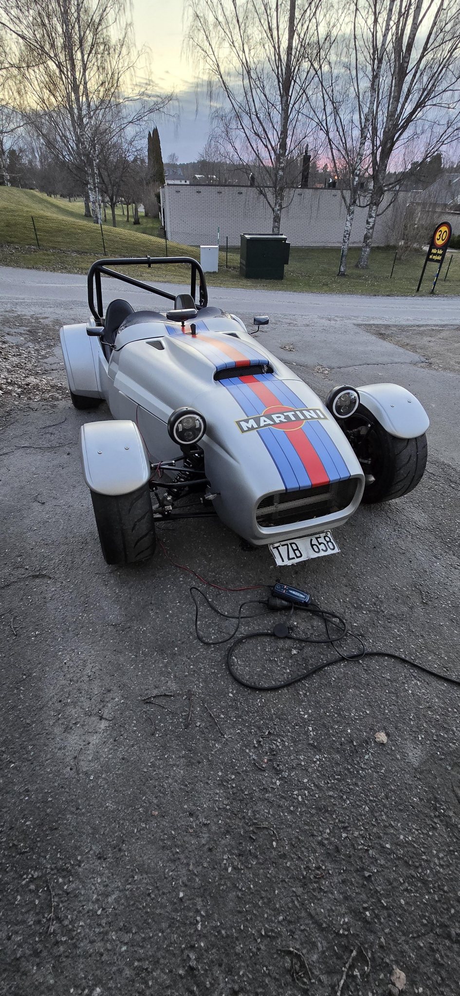 Batteriladdare ansluten från när jag kom hem Sparcomössa och Porscheskor Sätta ihop det sista Provtur Kom 30 meter innan det märktes punka vänster bak. Körde hem... Och pumpade upp däcket Nytt försök med provtur Batteritorsk...