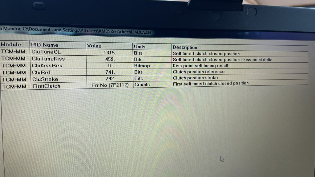 Lite kul att leka runt med AMDS och konstatera att bilen verkar må bra. Fina värden var än vi tittade. Passade även på att läsa ut kopplingsslitaget. Det är en rätt simpel lösning som består av en positionsgivare på slavcylindern. Totalt slag i cylindern är 20 mm och mätvärdena är mellan 0 och 2000. Helt ny koppling ger värden mellan 1300-1400 (13-14 mm) och den anses vara helt slut vid värden på 1800 (18 mm). När man når 1800 lägger bilen i neutral och man tvingas till bärgare. En otroligt korkad lösning och och i den sitsen vill man inte sätta sig i!