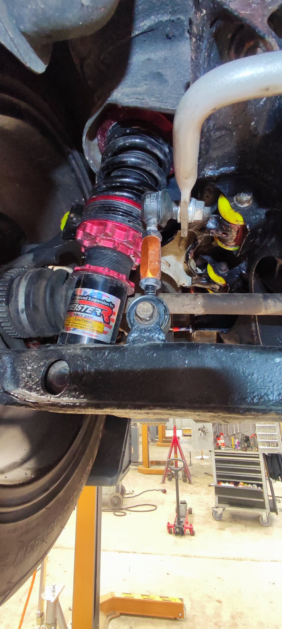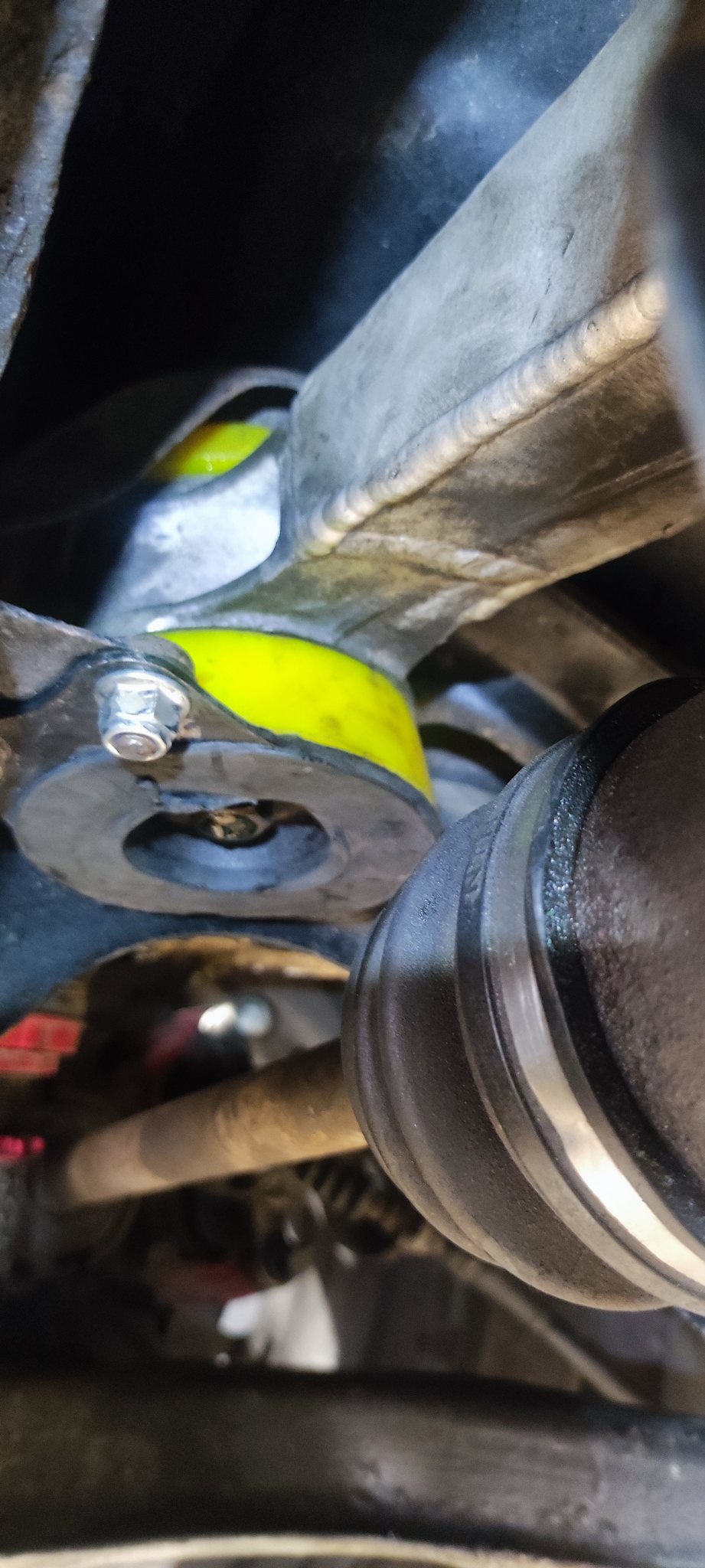 Beställde ett gäng bussningar från Teamseven som håller rätt mycket mx-5 grejer på lager och fasen postar sakerna grymt fort. Beställt 2ggr därifrån och alltid haft det på 2 dagar 👍 Rev ner bakaxeln och kapade bort den pinnbulten från subframen som gått av samt stoppade i polyuretan bussningar i diffen ist för gummi upphängning så rörelse blir minimal sida till sida. Hittade 12.9 M12 bult på lagret så använde mig av en sådan som jag trädde i ovanifrån och ner där jag kapat bort den skadade samt öppnade upp lite med en roterande karbidstål. Tigade det underifrån och snackade dit diffen/axlar. Som väntar sjuka vibrationer men det beror mest på flatspotsen på däcken jag drog på mig sist på banan 🫣 Mycket nöjd med känslan i bilen nu efter att jag gjorde en hjulinställning på den ! 🙂