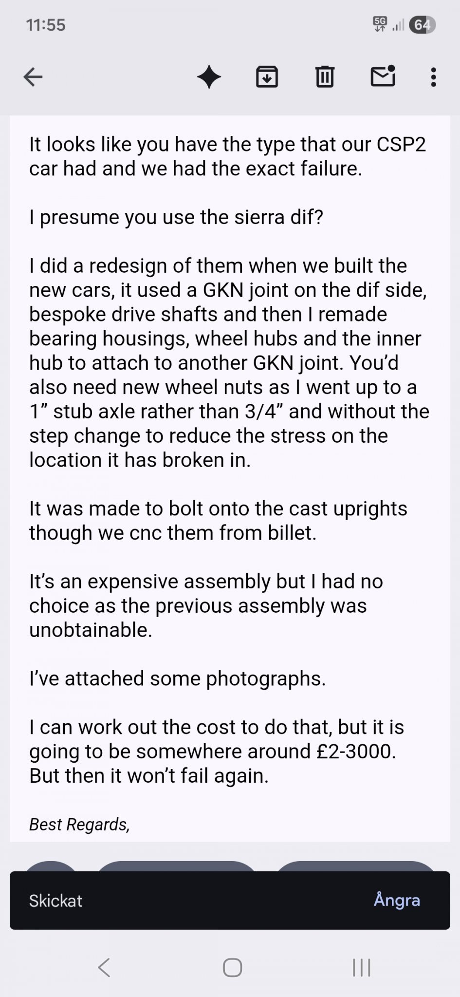 Nu vet jag inte hur undersidan ser ut av buklandningen... men, att åtgärda drivaxeln (dvs byta) kan ju inte vara alltför stort jobb? Alltid surt när sådana här bakslag händer, det tar liksom luften ur en, när man hade stora förväntningar och så kom detta... Det är liksom inte storleken på bakslaget som känns, mest besvikelsen att det inte gick som man tänkte sig. Att låta saker stå några dagar, sedan på med lite feel-good musik på BT högtalaren i garaget, muta sig själv med några garage-pilsner-längs-jobbet... Så brukar saker falla på plats, och allt blev roligt igen.