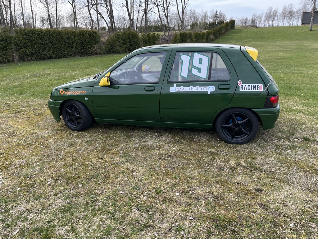 Då det börjar bli tvärfullt i race verkstan lär jag göra mer utrymme så några bilar ska säljas.. Denna kärra är en Renault Clio Junior Cup racer, perfekt insteg till tintops racing för gasglada ungdommar mellan 13-18 år! (Går att köra i SSK Klass 1 för de äldre..) Med cirkus 80 vilda hingstar under luckan är de ingen fartfantom men de kompenseras rejält när det börjar svänga lite