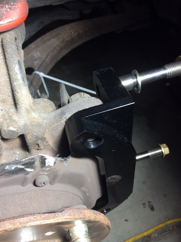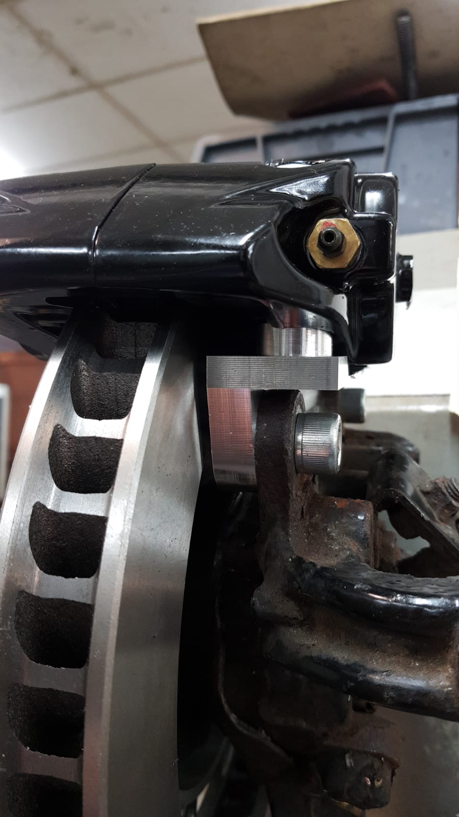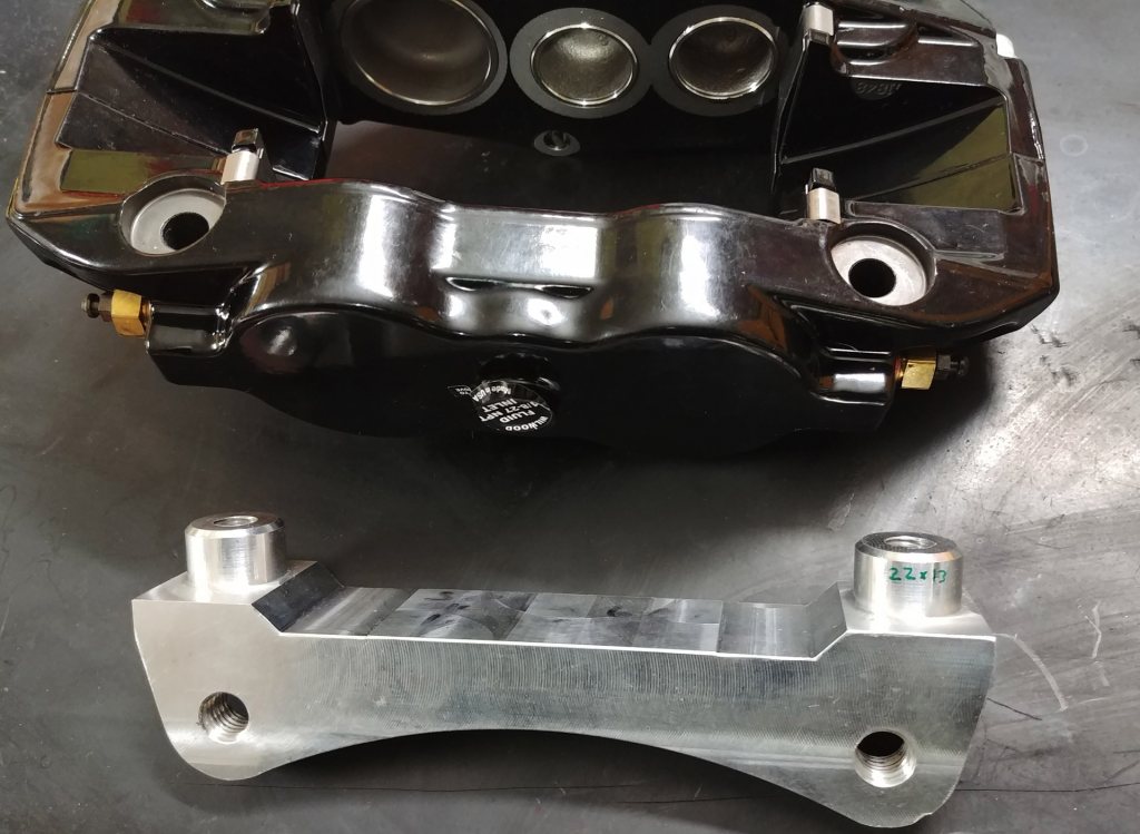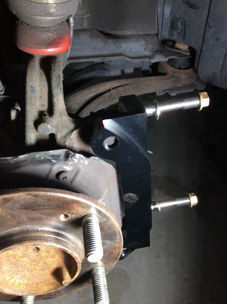Hittade ett par bilder på Stoptechs adapter till deras bbk, det är tydligen tänkt att originalskruven ska återanvändas trots att den är onödigt kort.