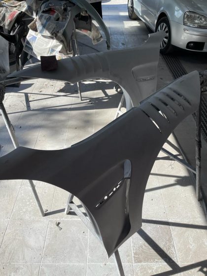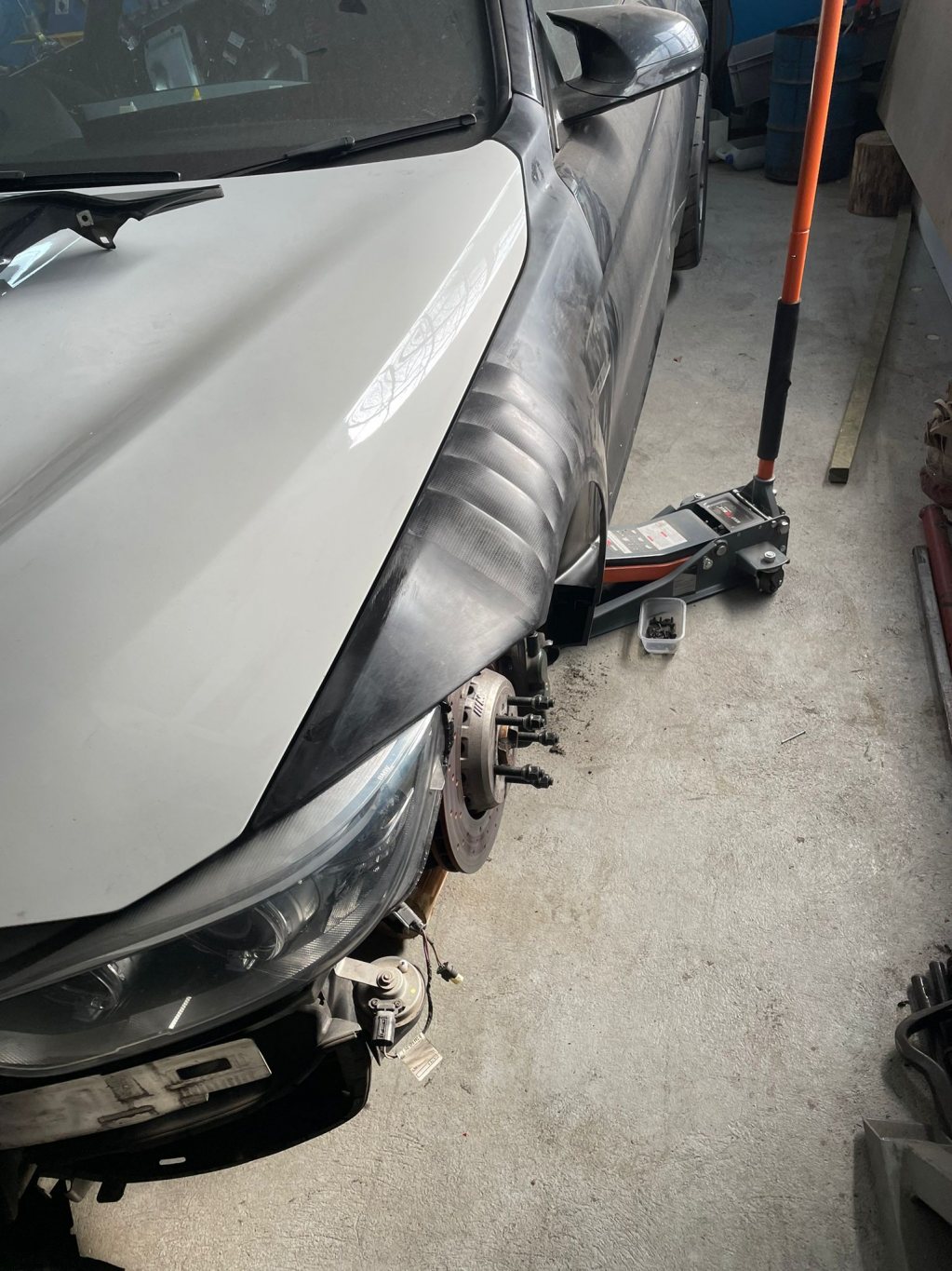 Väl hemma gick vi igenom skadorna. Inte så farligt ändå konstaterade vi. Beställde nytt och ombyggt fjäderben precis som övriga av Emerson så att bilen gick att rulla. Sedan bokade jag transport till Polen för reparation där jag har mycket kontakter. 4cm hade baken flyttat sig så detta riktades. Bakskärmen skars ut och en ny svetsades i. Då jag arbetar på en bildemontering tänkte jag att jag lätt skulle hitta en skärm men nix, givetvis när jag nu behövde så fanns inget utan fick köpa en dyr begagnad skärm på Allegro för 28 000kr