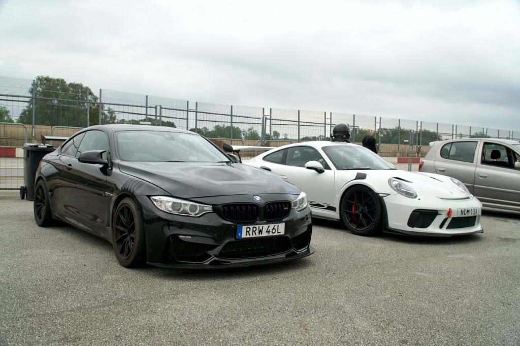 En bana, väldigt teknisk med tighta kurvor och låg fart. Ingen bra bana för en motorstark och tung bil som M4an utan passar lätta, mindre bilar mycket bättre. På Sturup är de inte så petiga med decibelgränsen så därför är det enda banan häromkring som går att köra med nuvarande setup på M4an. Oscar körde sin Porsche 991.2 GT3RS med Manthey chassi och sådant godis. Givetvis var vi sena ner till Sturup och de hade redan börjat köra när vi väl kom dit. Fort anmälde vi oss och sedan ut på banan. Jag har kört en del superbike på den tidigare och tog licens där med bil förra året så jag känner till banan hyffsat. Konstaterade att jag knappt behövde växla och att bilen var för stark. Jag var tvungen att hålla igen mycket för att inte sladda vilket nästan var oundvikligt ändå. Ar-1orna greppade fantastiskt och bromsarna bettade rejält. Jag märkte att jag kunde bromsa senare än Oscars GT3, så in i kurvorna tog jag in på honom, medans han kunde gå på gas tidigare och drog ifrån ut ur kurvorna. På detta vis höll vi på resten av körningen, sedan kom regnet och vi åkte hem. 1.09 blev min snabbaste tid. Denna satte jag bland de första varven för dagen. Jag justerade inte däcktrycket alls under körningen utan endast när vi anlände och borde tappat ur lite när däcken var varma och uppe på 2.4bar