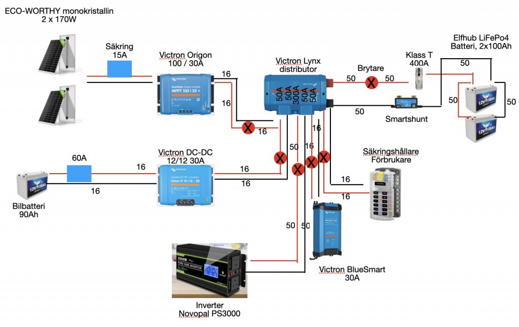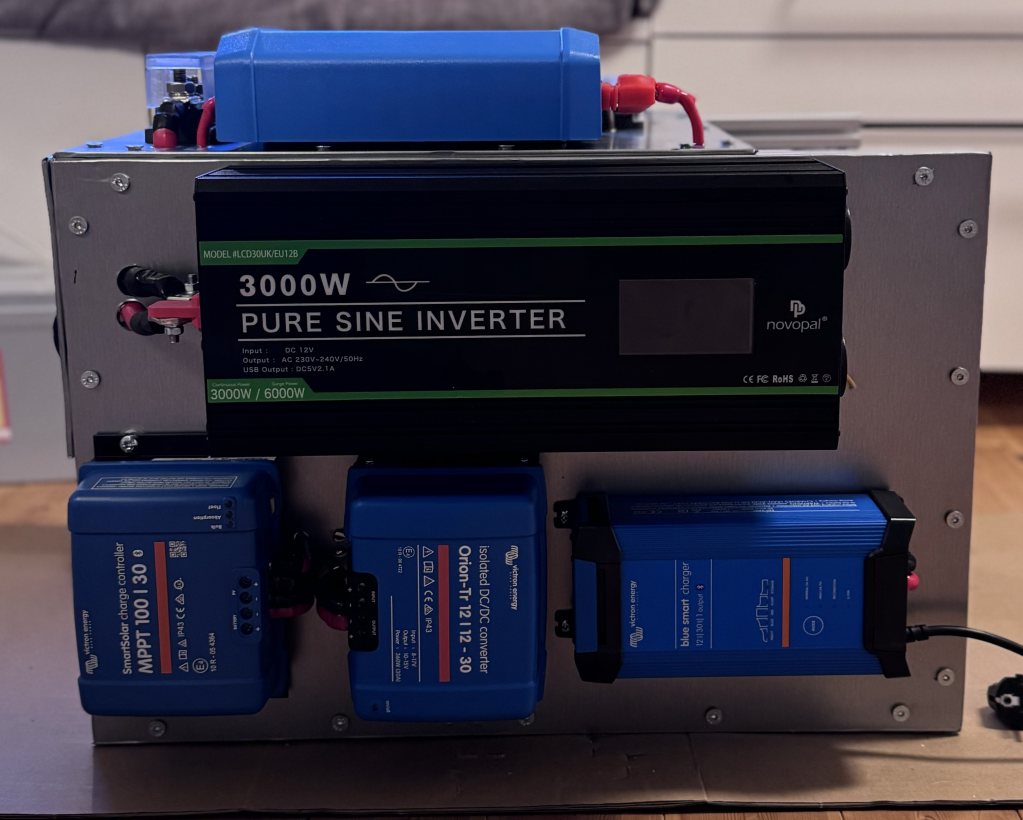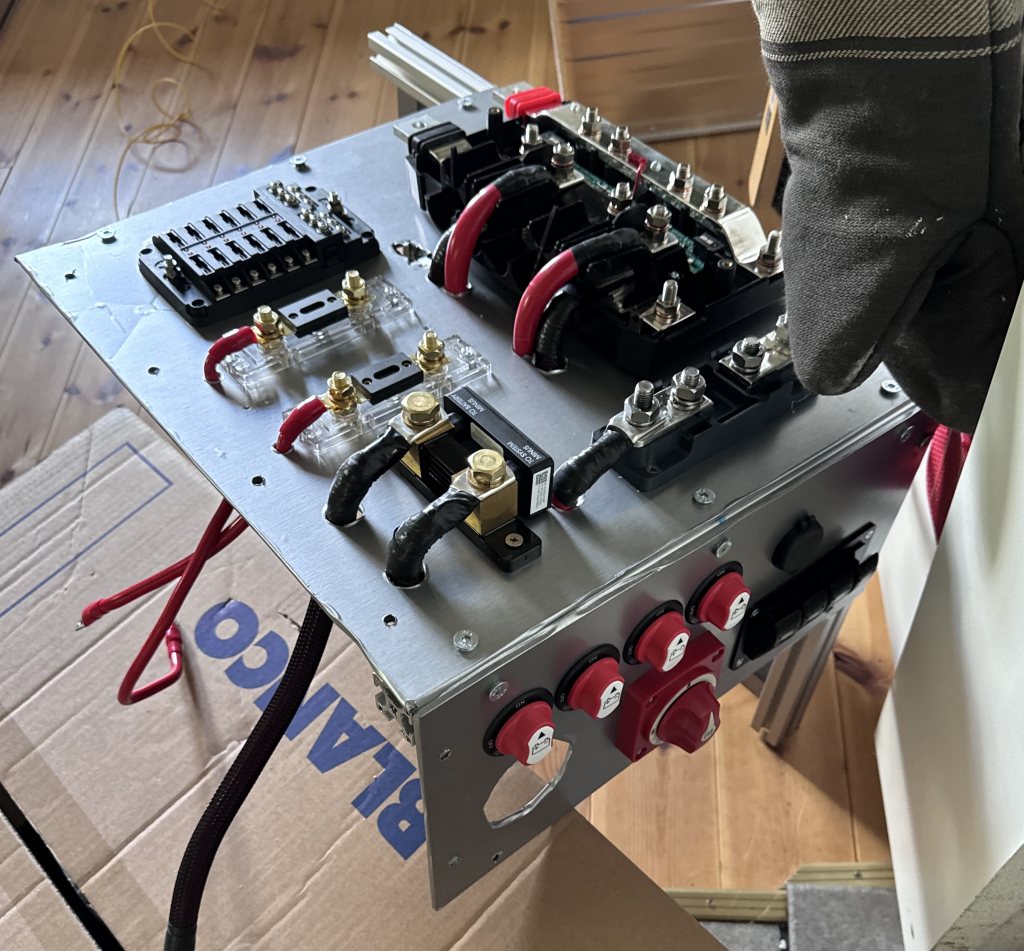 Det blir stora strömmar för att driva ugn och induktionsspis, så en stor inverter krävs. Vill inte vara för beroende av extern laddström, så utöver 220V batteriladdare valdes 2 100Ah batterier som kan djupurladdas, två solcellspaneler på taket & styrning för att ladda batterierna med bilen när den körs. Har plats för ett till batteri om det skulle behövas, men enligt mina beräkningar tror jag inte det. Försökt vara noga med dimensionering av kablar, säkerhetsbrytare & avsäkring av allt. Var lärorikt att läsa på om detta igen & största nyheten var behovet av Klass T säkring för batterilagret pga de extremt stora strömmar LiFePO4 batterierna kan ge. Dyrt, men känns bra att vara försiktig. I efterhand skulle jag nog valt att använda reläer i större omfattning än jag gjorde. Men känns helt ok som det blev. Målet var att bygga en elcentral som jag kunde färdigställa utanför vanen & sedan bara koppla kablaget i själva vanen till denna. Både för att få det hela kompakt, men även underlätta eventuella ombyggnationer/uppdateringar framöver. Var en hel del funderande (kul!) och jag tycker det blev helt OK till slut även om man så klart kommer på alternativa och bättre lösningar när man är färdig