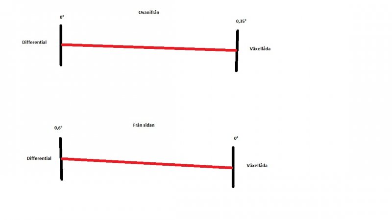 Skissade ihop en bild lite snabbt i paint för att illustrera vad jag menar. (kraftigt överdrivna vinklar på skissen) Ska föreställa diffens och växellådans flänsar med kardanen i rött mellan. Motor/låda sitter 0,35° snett medans diffen lutar 0,6° uppåt. Kardansens lutning räknade jag bara på lite grovt på. Kardanen är 760mm lång och höjdskillnaden i horisontalplanet är c:a 20mm mellan flänsarna.