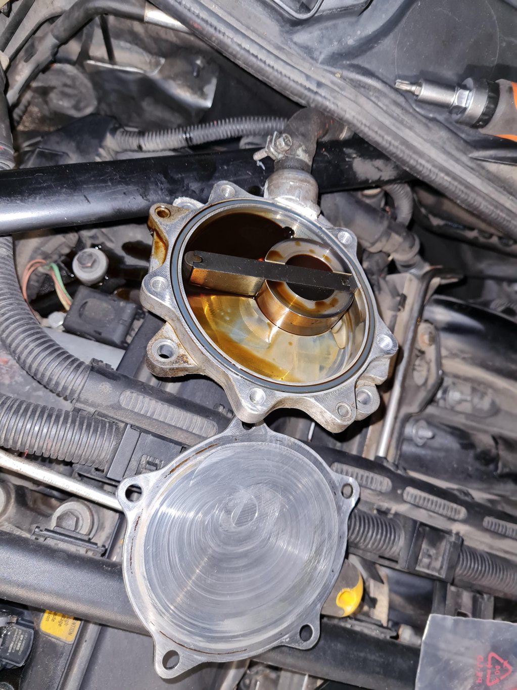 Dit mer oringen som tätar mellan toppen och vaccumpumpen. Den va lite stor, så knepet med fett var egentligen inte optimalt här, men till slut va allt på plats igen, och tätt märkte jag när jag åkte till jobbet. Ingen oljedoft heller längre!