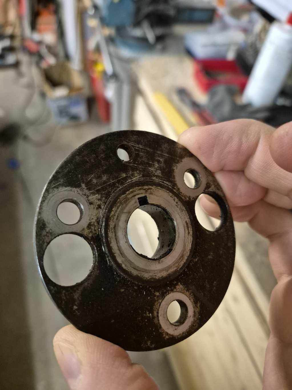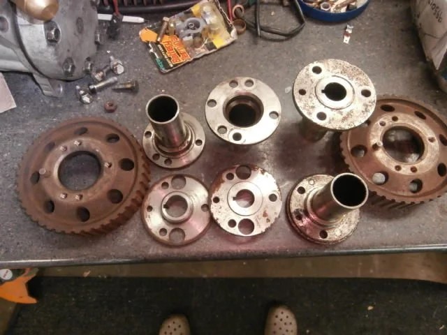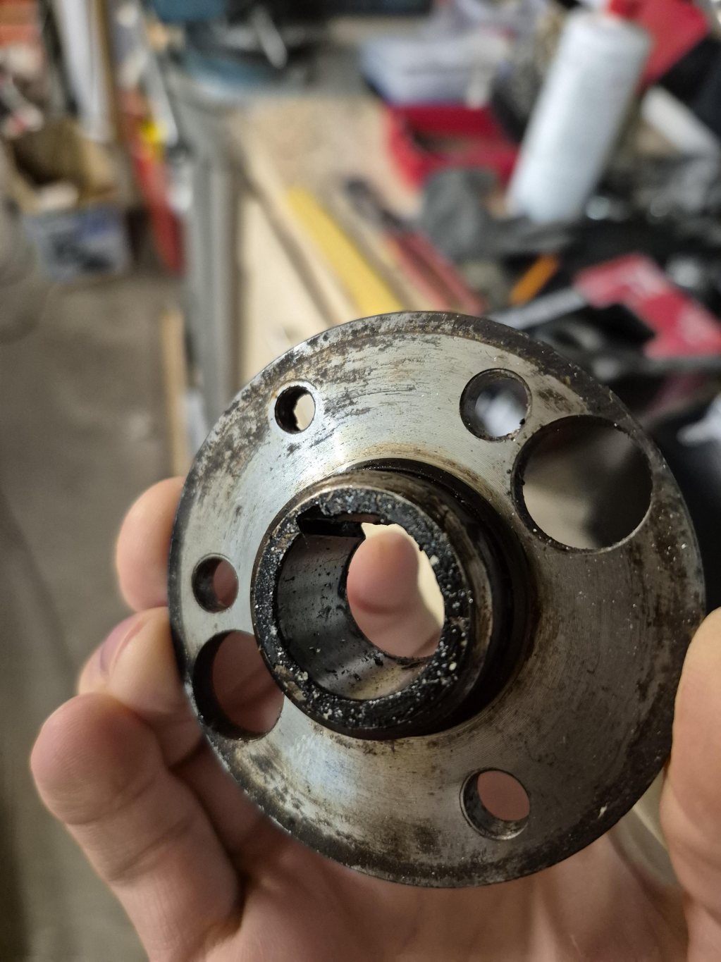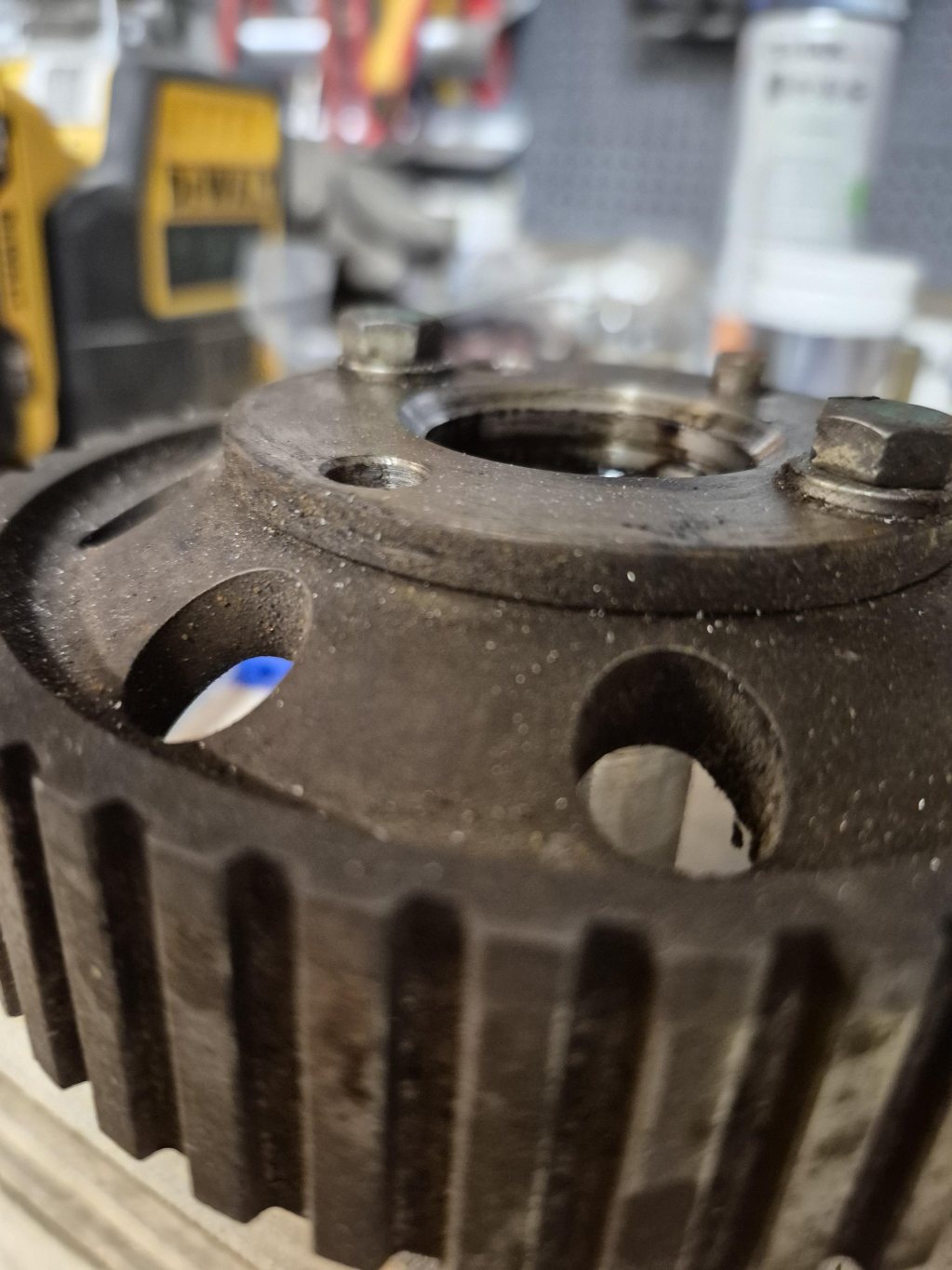 Dom två skruvarna som sitter kvar håller ihop drevet och en hylsa som går in och tätar mot en pack om. Jag ser inte riktigt poängen med dom då de andra tre skruvarna går igenom flänsen för hylsan och är gängade i drevet med.. Det finns drev utan dessa två och då gade de ju varit betydligt enklare att göra justerbart.