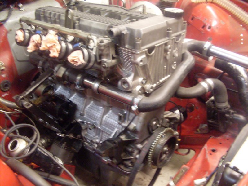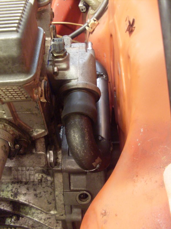 Denna motorn är från en 155/164 -94, men alla Alfor med tvärställd motor har termostaten på motorns bakkant, så det är inget unikt. Det är trångt, men fäster jag upp kylröret på något sätt blir det ca 10mm frigång. Jag har övervägt olika varianter, en 75 termostat framme vid kylen bl.a Men denna lösning verkade vettigast. Så jag är inte beredd att förkasta den innan jag provat. Jag hade röret på insugsidan ifjol, fick stående luft då. Kanske inte pga av just det men, men...