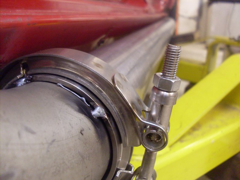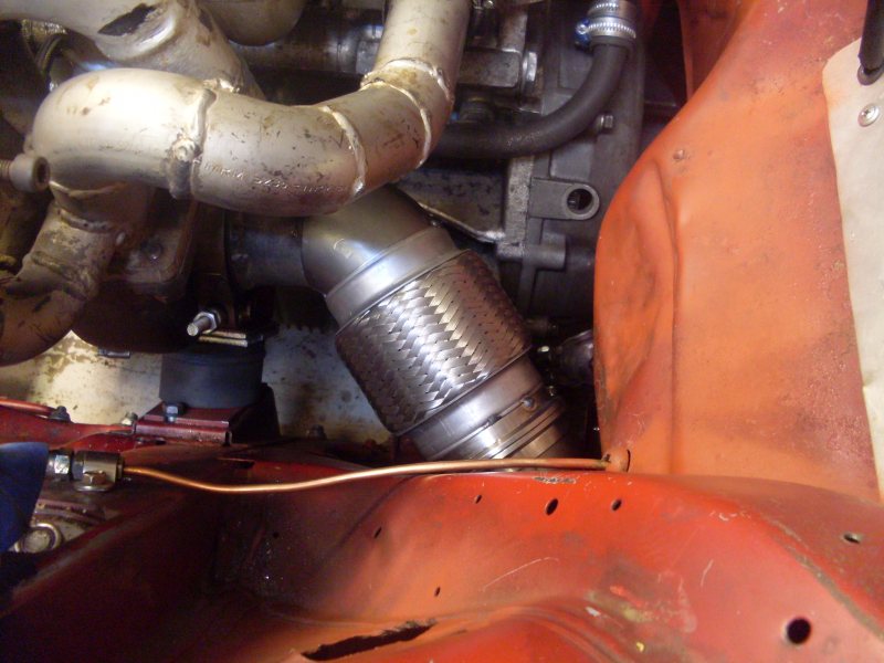 3" flexrör, monterat i 45 vinkel för att ta upp rörelser både i längsled och sidled. Den som hittade på V-band borde få Nobels Fredspris. SÅ mycket enklare,även om det fortfarande är mycket jobb innan allt passar...
