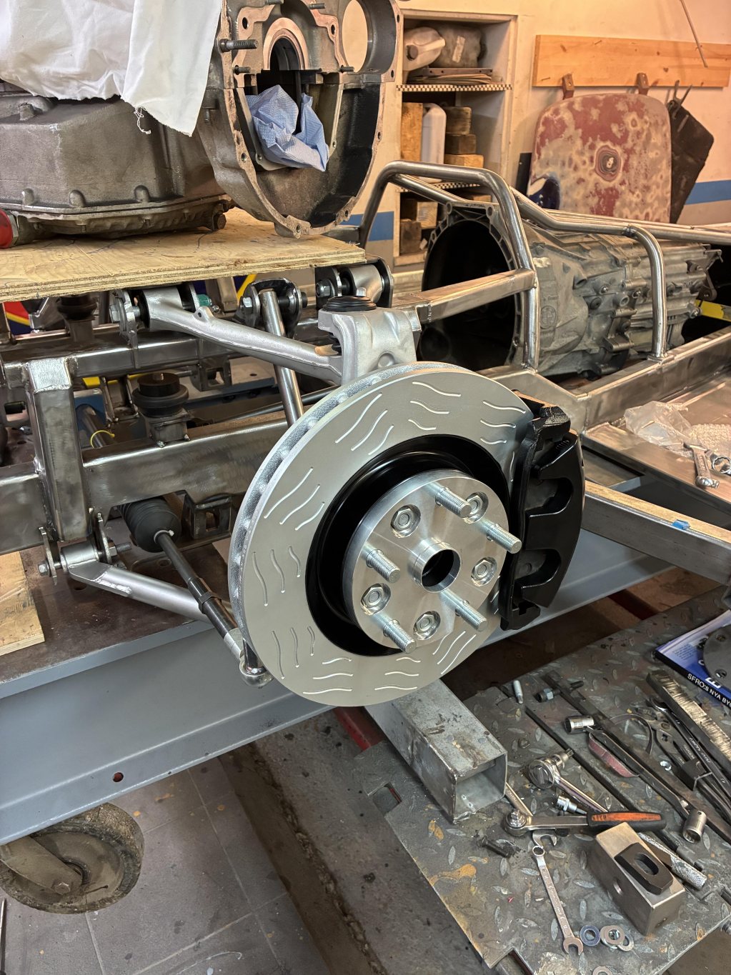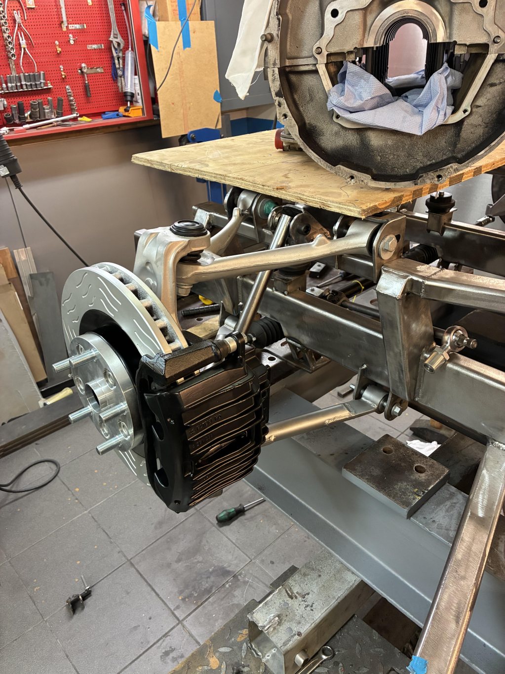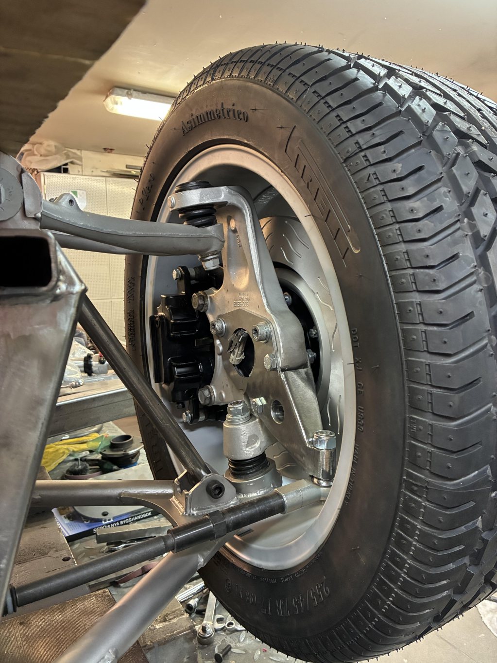 Det ser kanske inte ut som det hänt så mycket men det känns äntligen som jag har fått koll på en massa geometri och lösningar där utrymmet varit mycket begränsat. Styrväxel på plats, nya styrarmar byggda, stötdämpare och infästningar på plats både fram och bak. Ny infästning för toestagen bak och en teoretisk lösning på drivaxlar inhandlat.