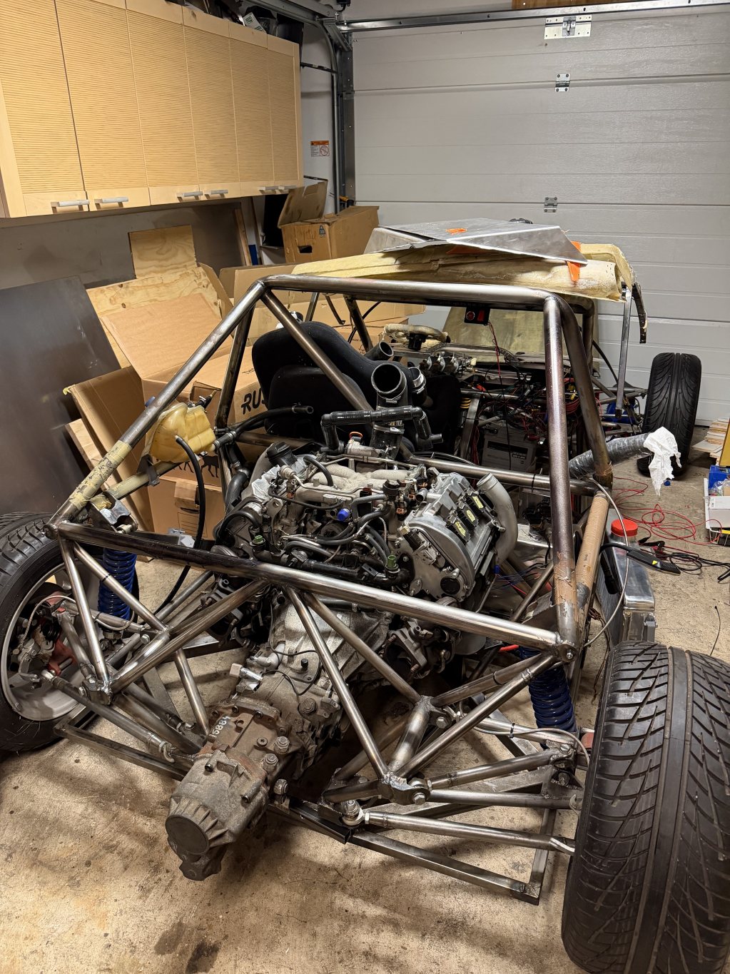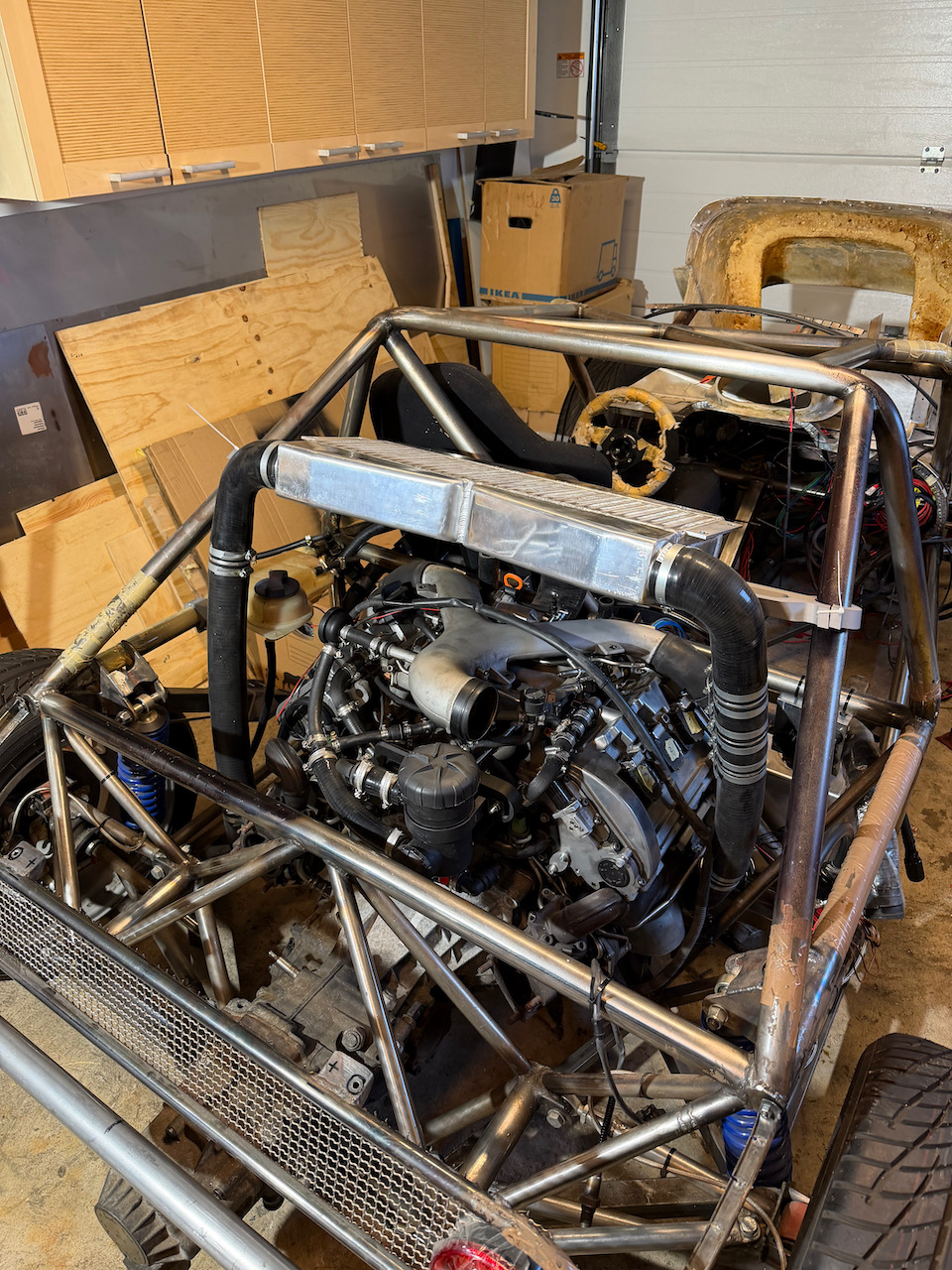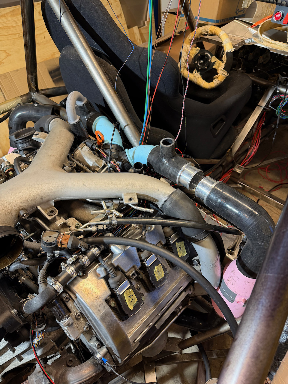 Jag har bytt från den tidigare gräsliga intercoolern ovanpå motorn till en mycket mer elegant lösning med luft-vatten. Det blir en avsevärt mindre volym att trycksätta och jag får mer flexibilitet med placeringen av kylaren. En cylindrisk luft-vatten intercooler till var turbo gör det också enklare. Delarna återstår att beställas, men forskningsarbetet är klart. Kabelhärvan är klar sånär som på knacksensorerna och en extra lambda som behöver beställas. Sen behöver den kläs också, såklart. Jag vågade även slå på tändningen och se maxxecu'n starta upp på datorn - riktigt häftigt. DBW funkar, solenoiderna rör på sig, alla sensorer läses av fint - inga error på min modifierade startmapp. Avgassystemet (om man kan kalla det ett system, det är ju bara några korta rörstumpar och en liten ljuddämpare) är färdigskissat, beställer delar och svetsar ihop i närtid. På tur står att lyfta ur motorn och svetsa nytt fäste till växellådan, samt höja motorn några mm då tråget svävar en hårsmån över ramen idag. Bilder och fortsättning följer. |