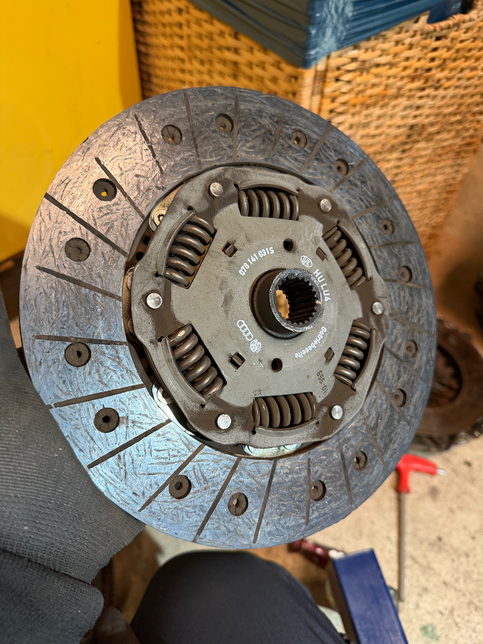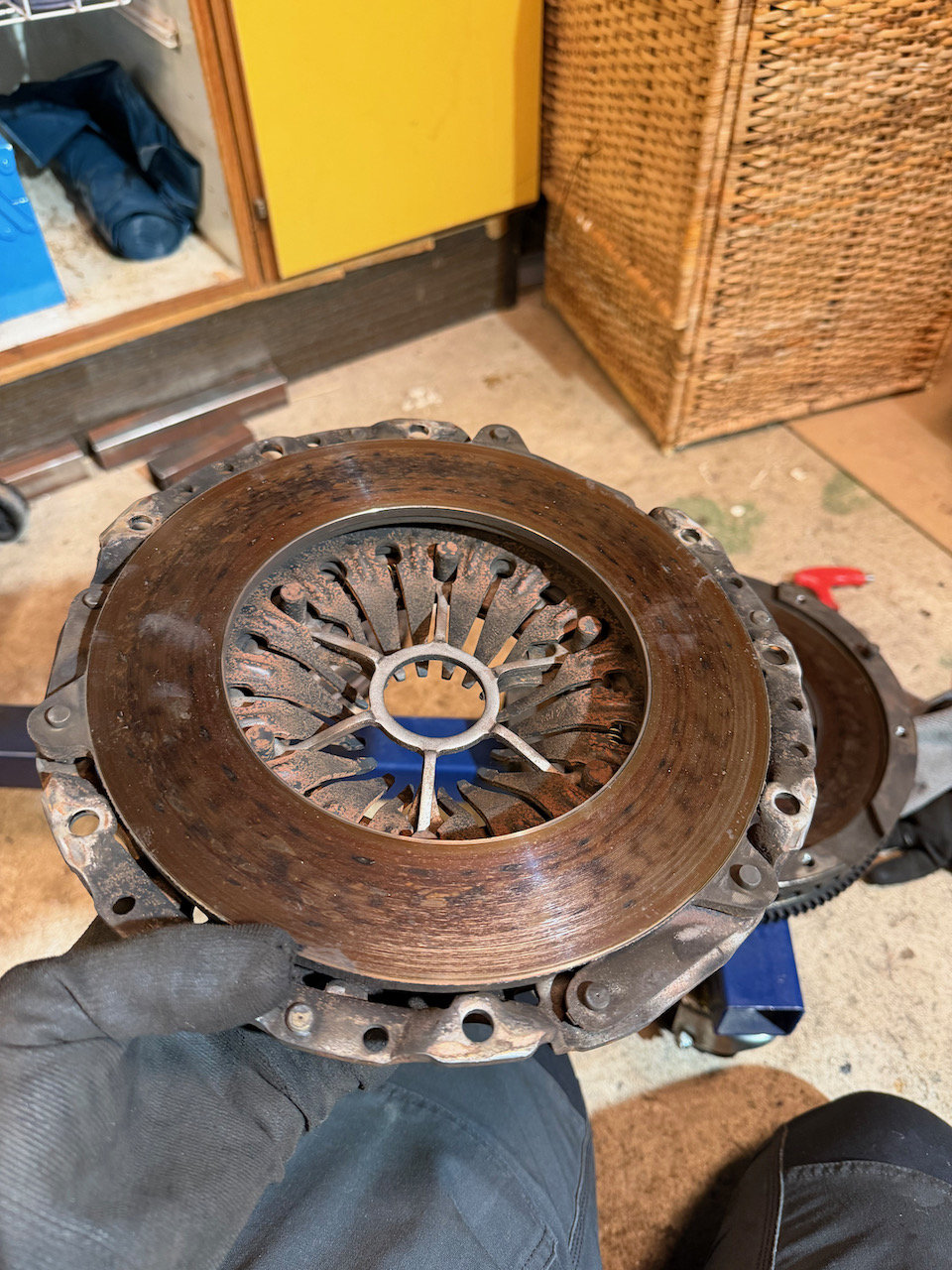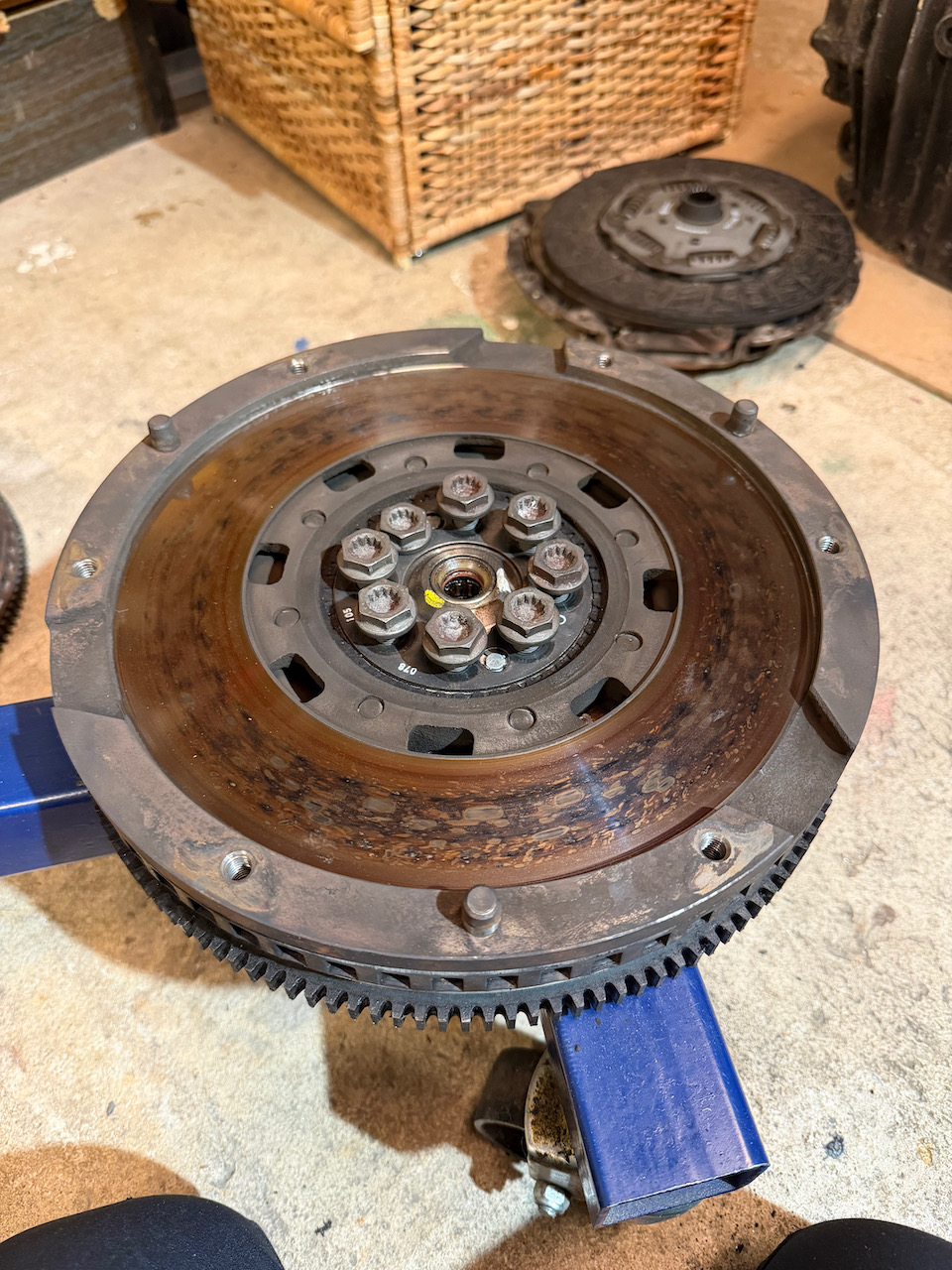 Då provstart är nära grävde jag fram koppling, tryckplatta och svänghjul som följde med motorn. Kopplingen har lite att ge men svänghjul och tryckplatta är inga skönheter. Får duga så länge.