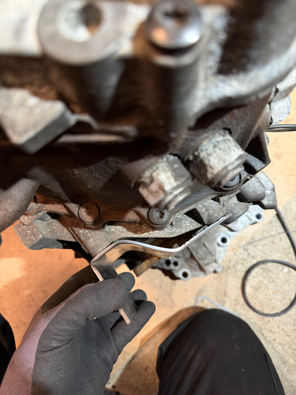 Örat i fråga är fortsatt obekvämt nära remmen och ska få krympa lite nästa gång jag lyfter ur motorn. Slutligen så handbankar jag några växellådsfästen ur 3mm plåt. Dessa ska få en liten förstärkning svetsad och sedan möta gummifötter på chassit.